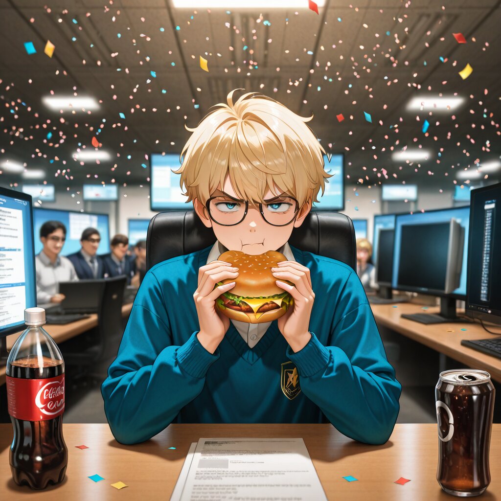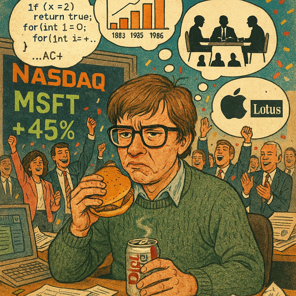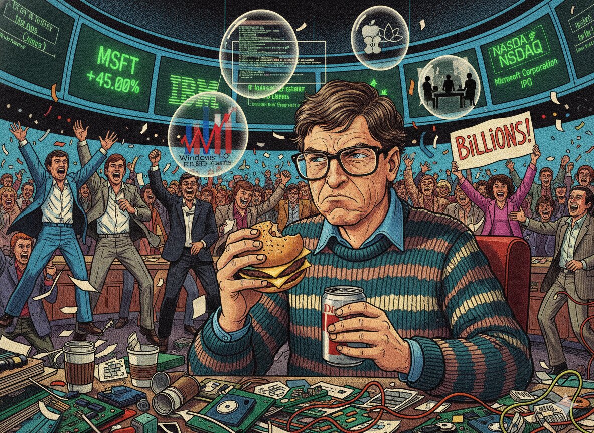 Detailed illustration of a 30-year-old software genius (resembling young Bill Gates) sitting at a cluttered desk during his company's IPO on March 13, 1986. He has a grumpy, dissatisfied expression, wearing oversized glasses and a messy sweater over a collared shirt. He is dismissively eating a cheap cheeseburger and holding a can of Diet Coke, looking bothered by the surrounding celebration. In the background, a chaotic trading floor scene: NASDAQ screens showing "MSFT" stock price skyrocketing (+45%), enthusiastic employees in 80s business attire cheering and throwing confetti. Hovering around the protagonist's head are semi-transparent thought bubbles or floating icons representing his mental stress: complex software C++ code, massive R&D cost charts for Windows 1.0, intense negotiation scenes with IBM executives, and silhouettes of rivals like Apple and Lotus. The contrast is sharp: a billion-dollar success in the background versus a lonely, stressed engineer who just wants to go back to work. Retro 1980s editorial illustration style, vibrant but with a touch of grit.