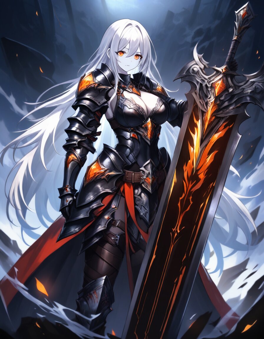 1girl, solo, ghost girl, silver hair, long hair, pale skin, orange eyes, armor, huge weapon, sword, masterpiece, best quality, high quality, absurdres