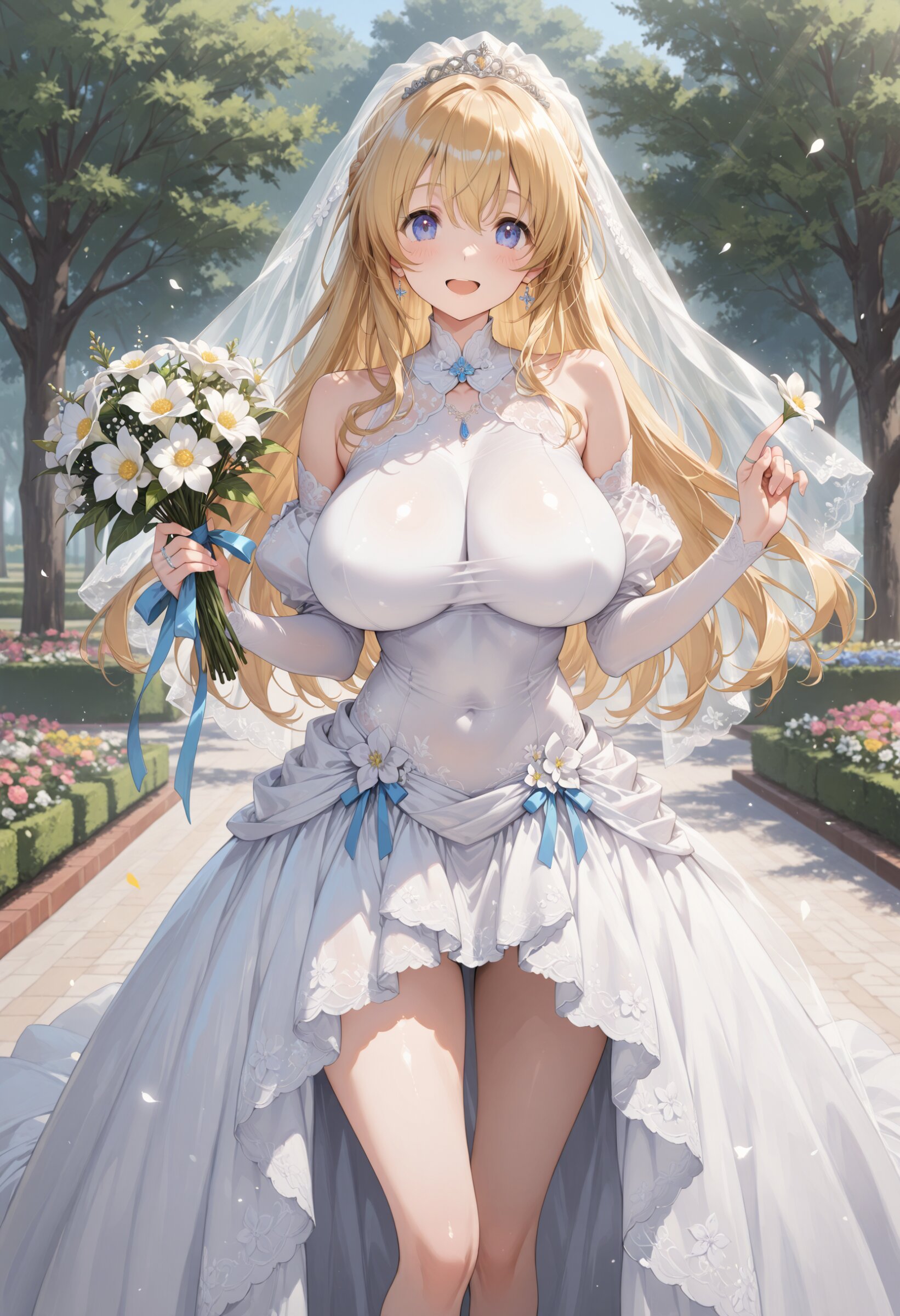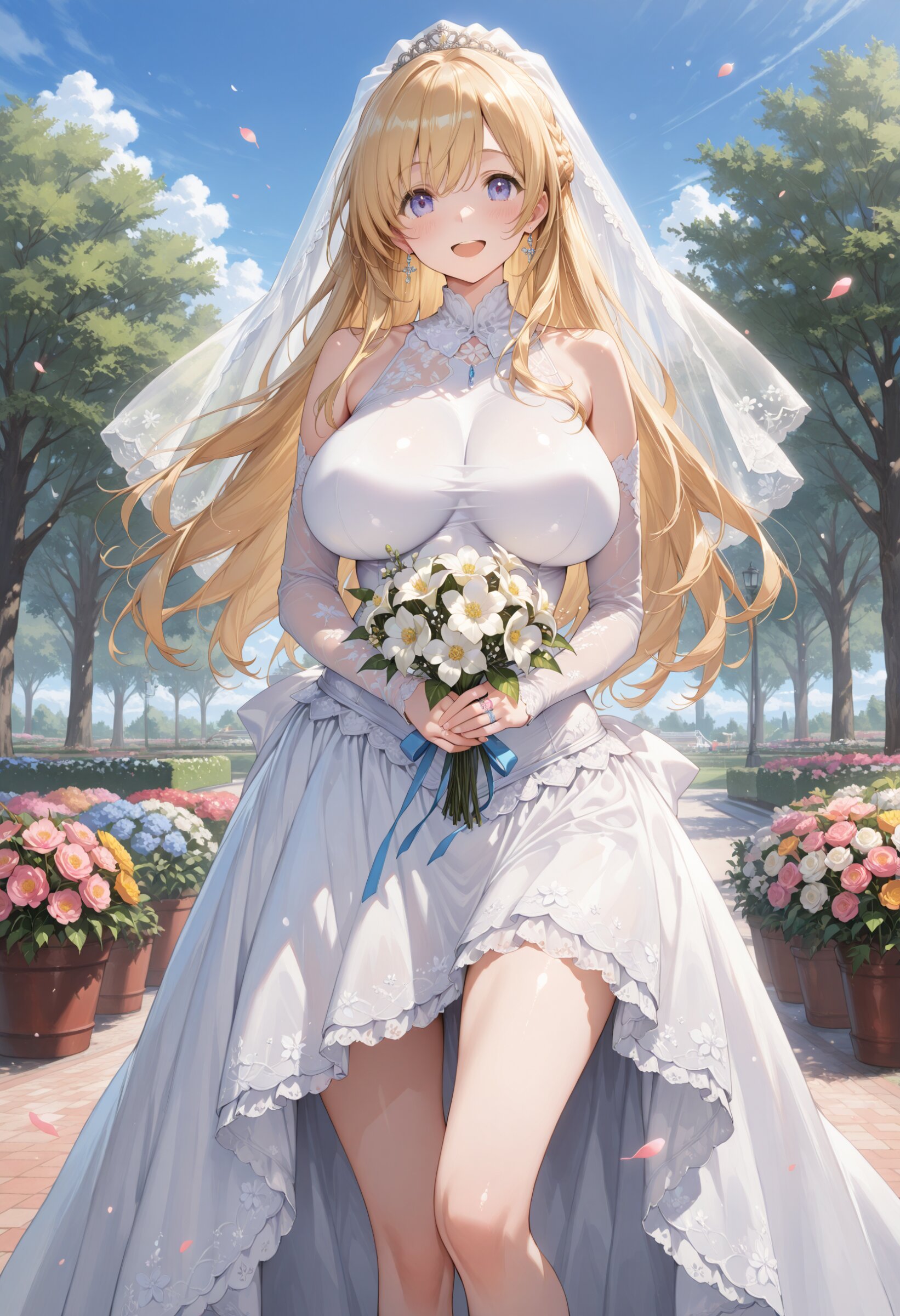 masterpiece, best quality, highres, ultra-detailed, extremely detailed, detailed, 1girl, beautiful blonde hair, wedding dress, detached sleeves, bare shoulders, slim legs, huge breasts, impossible clothes, perky breasts, happy, Flower park, Ring on left ring finger, hold a flower bouquet, look at viewer,