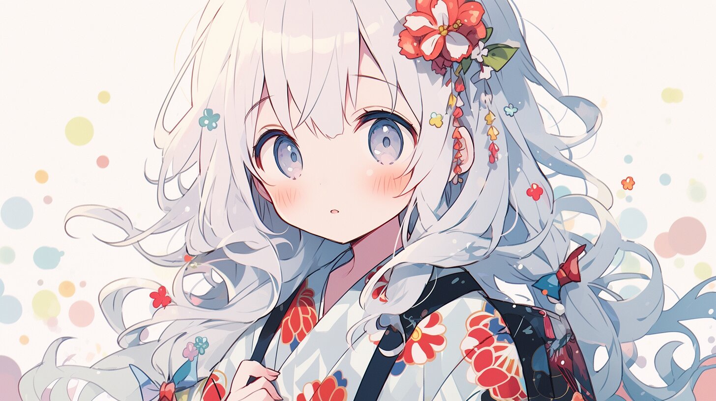 夏祭りの賑わいの中で、白髪の少女がふと立ち止まる。浴衣に散りばめられた花模様が、夜風に揺れる。彼女の瞳には、遠くの花火の光が映り、胸に秘めた小さな願いが芽生えていた。偶然出会った謎の少年との会話が、忘れられない冒険の始まりとなる。花びらが舞う中、少女の心は優しく揺らぐ。この瞬間が、永遠の思い出に変わるのか?
