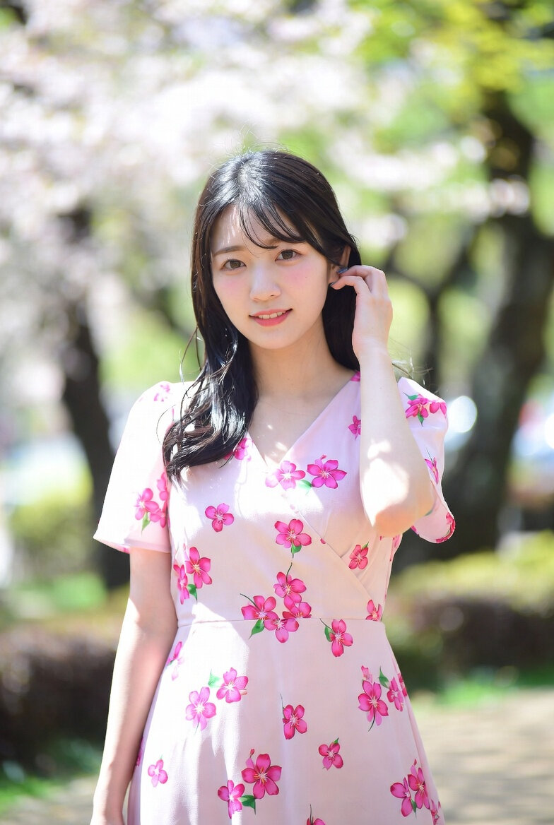 日本人女性23歳のリアルな写真、プロのカメラマンによる撮影テクニック。 ワンピースを着ている。ワンピースは春の花がモチーフで薄いピンク色。背景は日本の公園。自然な太陽光。