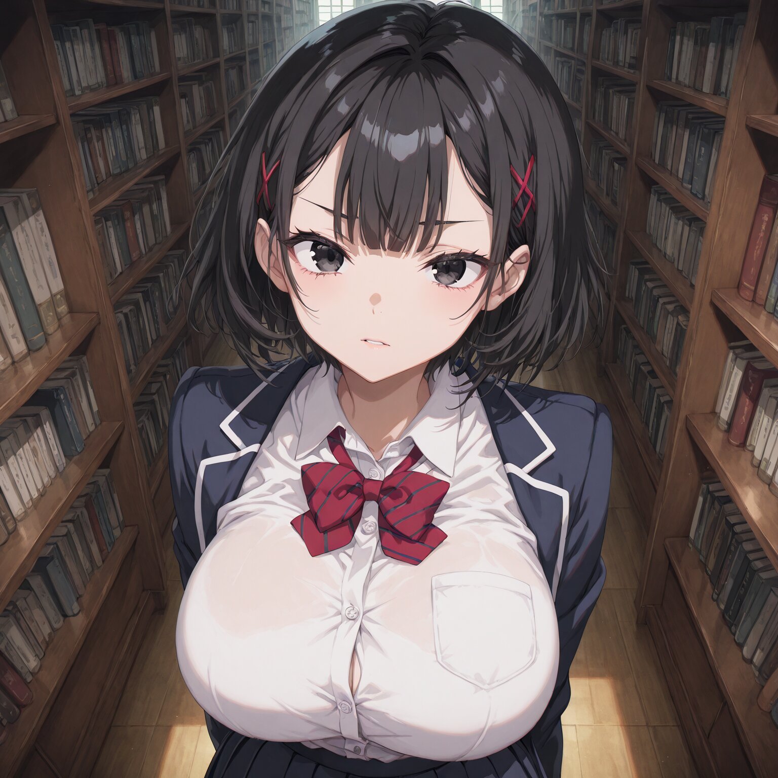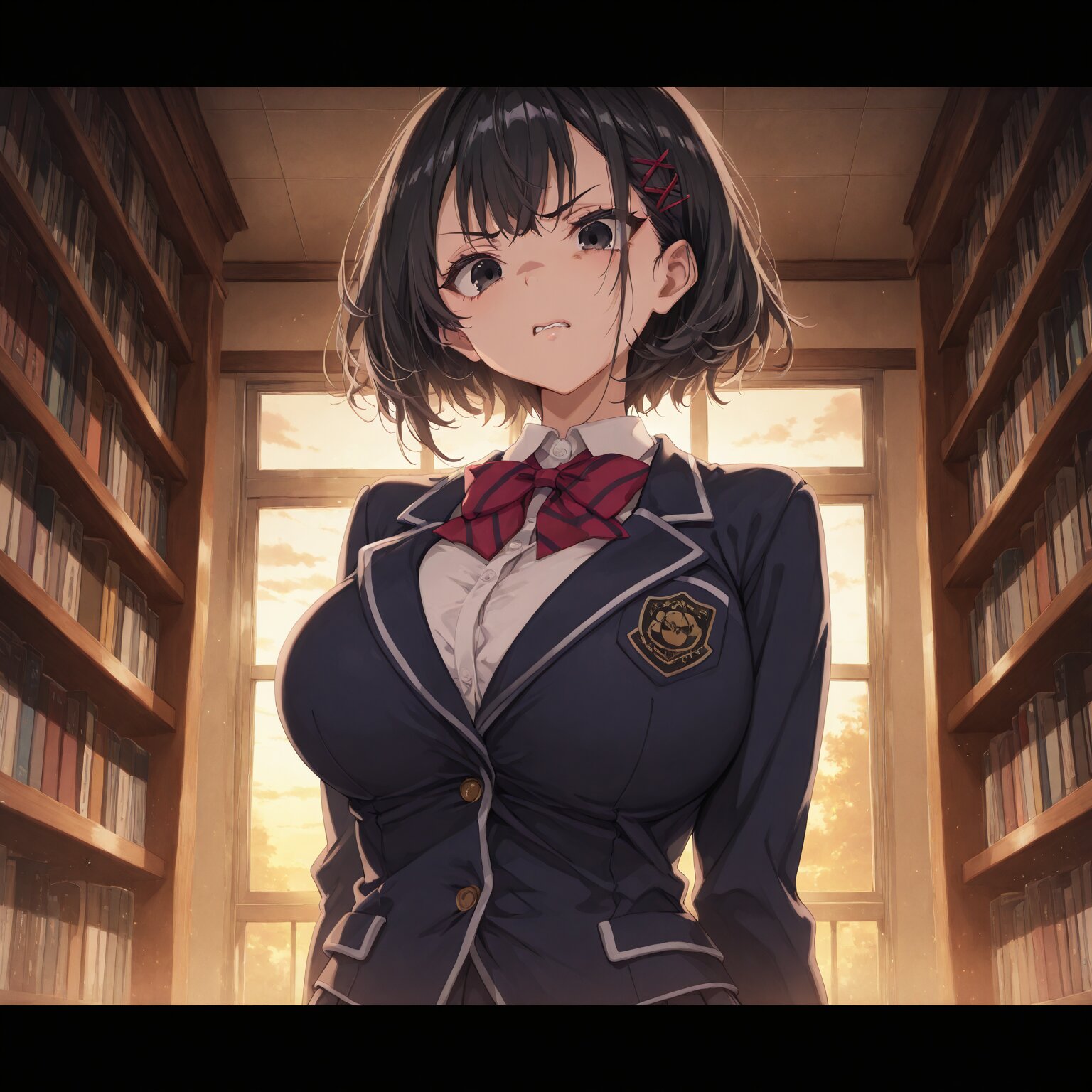 1girl, Black hair, short hair, sharp eyes, mean look, center-flap bangs Muscular, firm body Huge breasts, School uniform, blouse, dress shirt, blazer, pleated skirt, Disgust, disgusted face, Library, school, evening, indoors BREAK, (newest, anime, animation, anime screen capture, anime style:1.3) BREAK, (masterpiece, , vibrant, very aesthetic, highly detailed, best quality, 16k:1.3)
