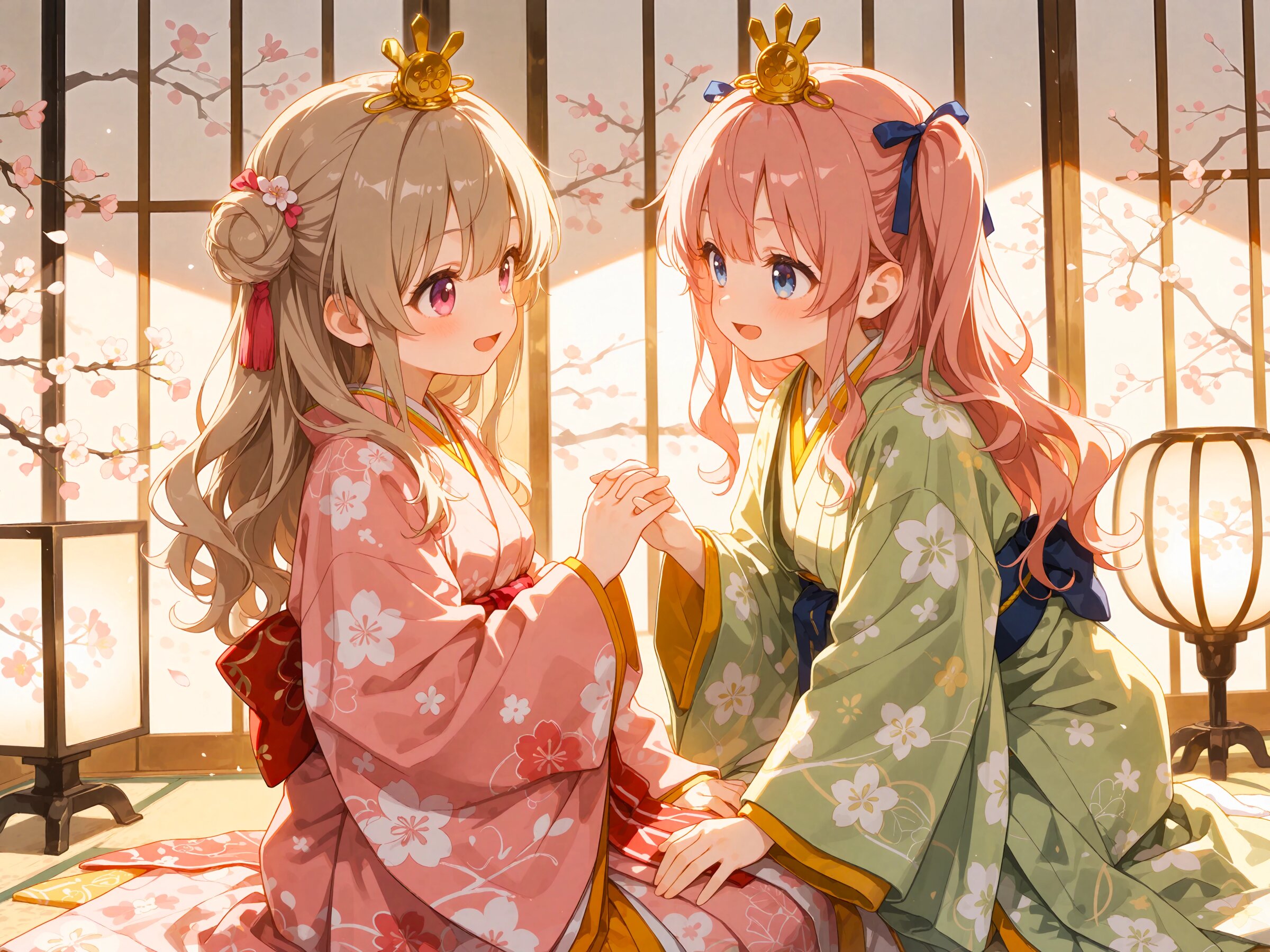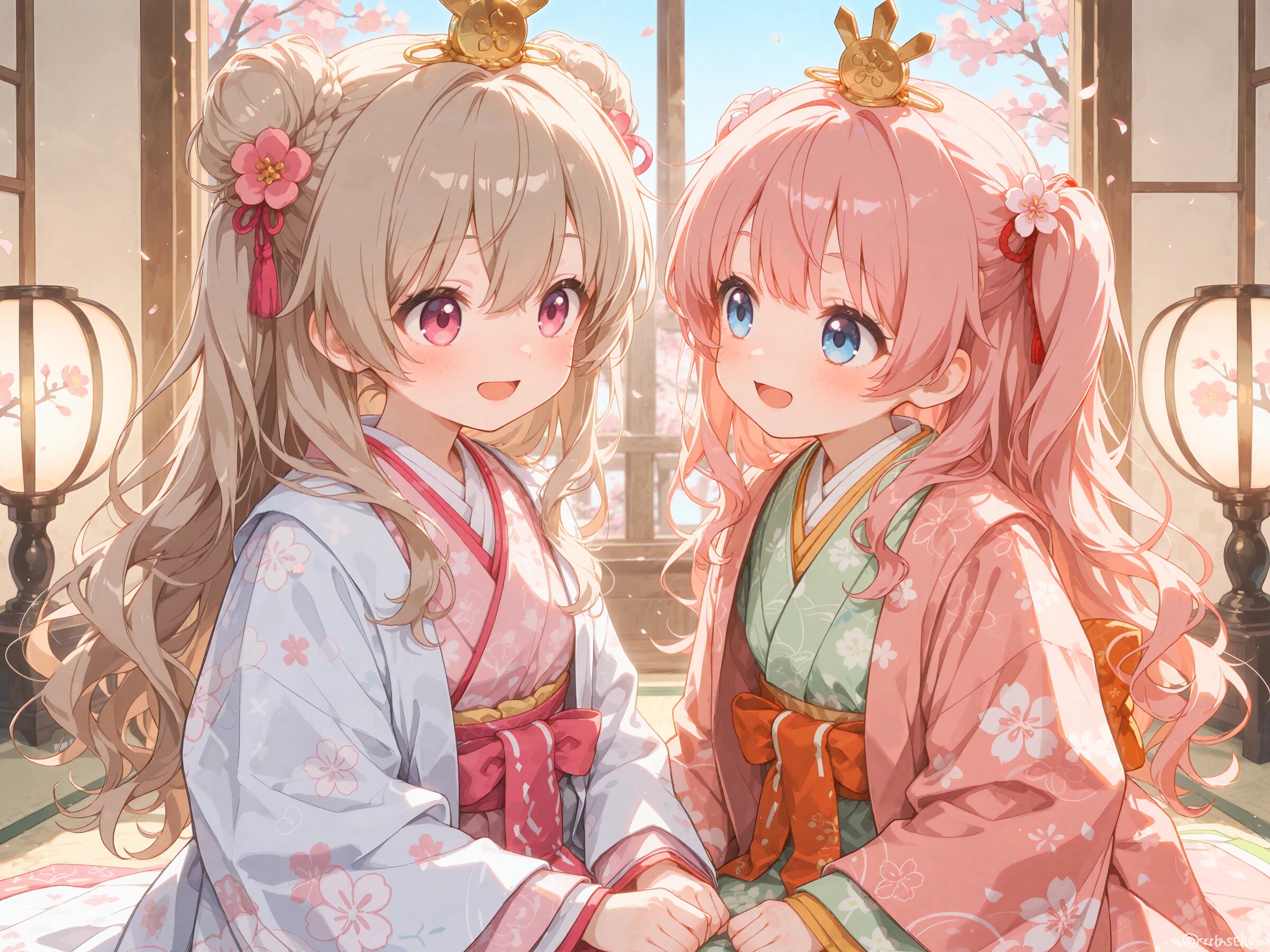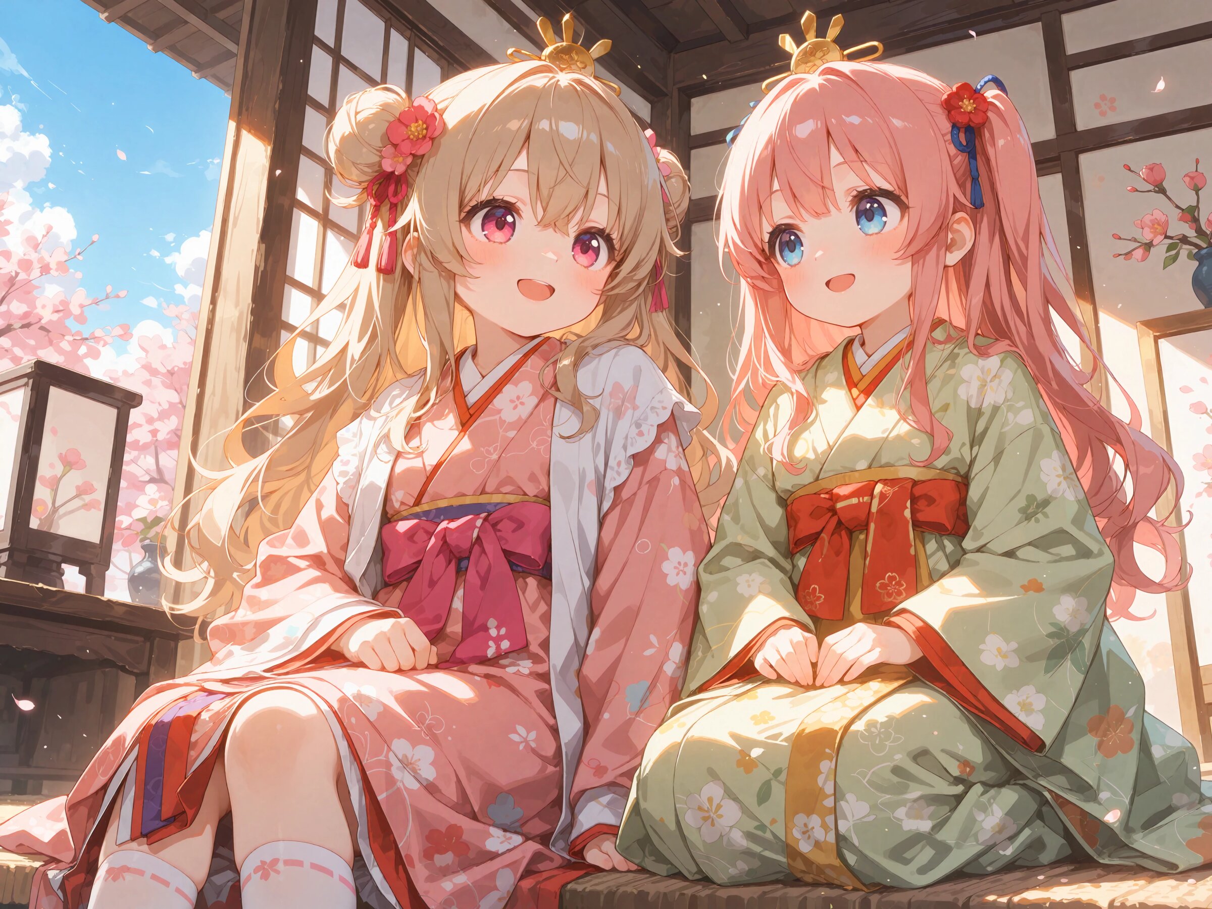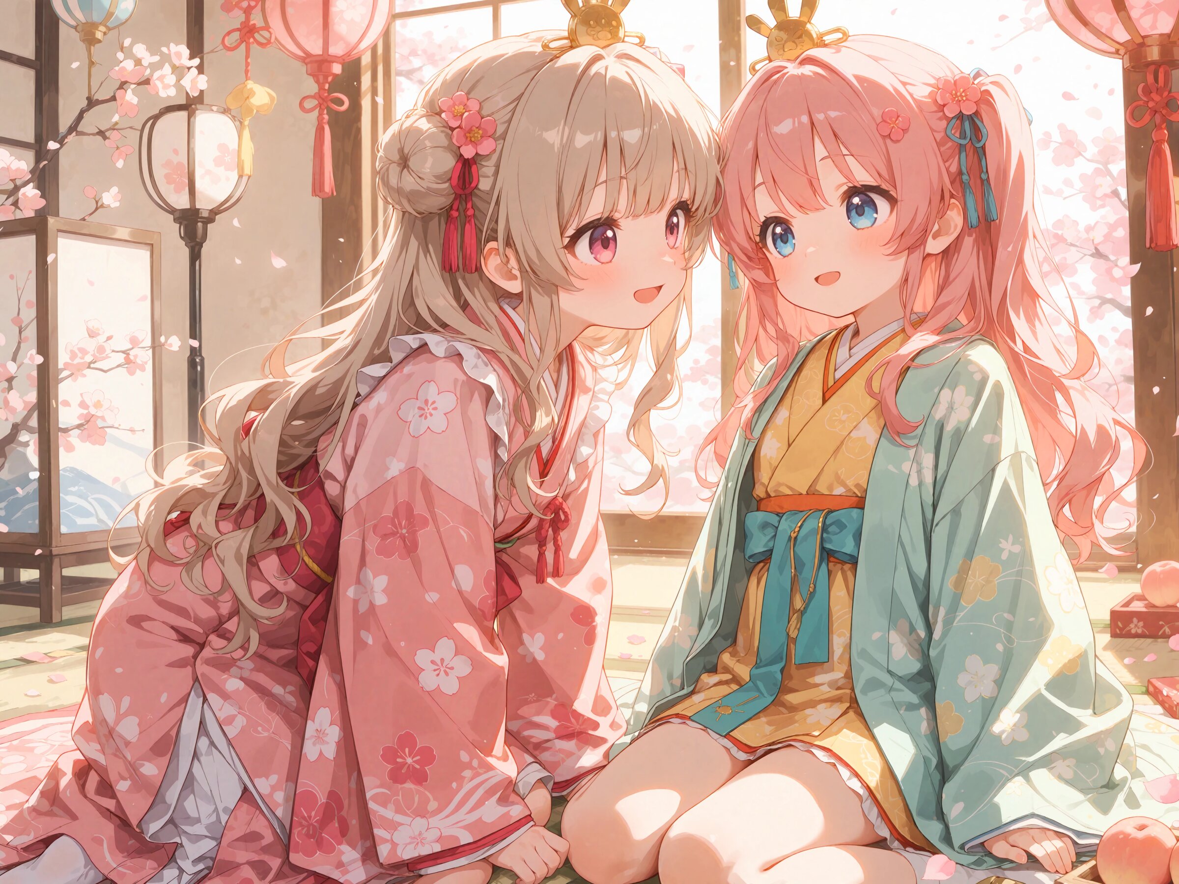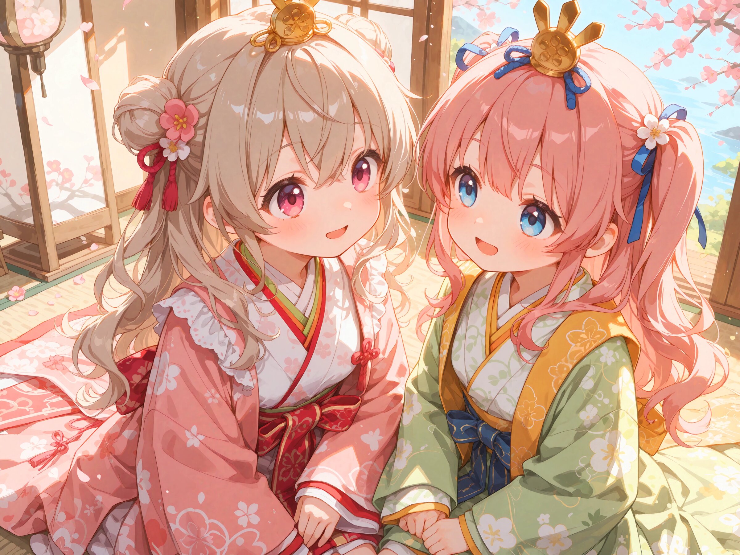 // これは自作Workflowの4つあるプロンプト欄それぞれに入れたプロンプト // common / prepend 2girls, yuri couple, colorful, looking at another, dutch angle, cropped arms, sitting, side by side, ohinasama, japanese clothes, layered kimono, long sleeves, sleeves past wrists, wide sleeves, print kimono, multicolored clothes, multicolored kimono, haori, flower hair ornament, japanese room, set of dolls on display, (bluesky:1.2), peach blossom, // region 1 (cute girl, pink eyes, cute eyes, large eyes, pink ribbon, light brown hair, medium long wavy hair, two small buns, bangs between eyes, bobby pin, small breasts), pink kimono, blush, light smile, open mouth, // region 2 (cute girl, blue eyes, cute eyes, large eyes, blue ribbon, pink hair, long wavy hair, two side up, bangs, small breasts), light green kimono, blush, light smile, open mouth, // common / append Masterpiece, Best quality, Amazing quality, Very aesthetic, Absurdres, Highres, Hi res, Newest,