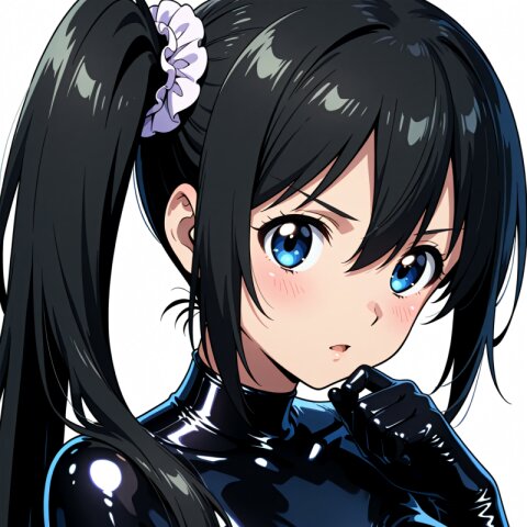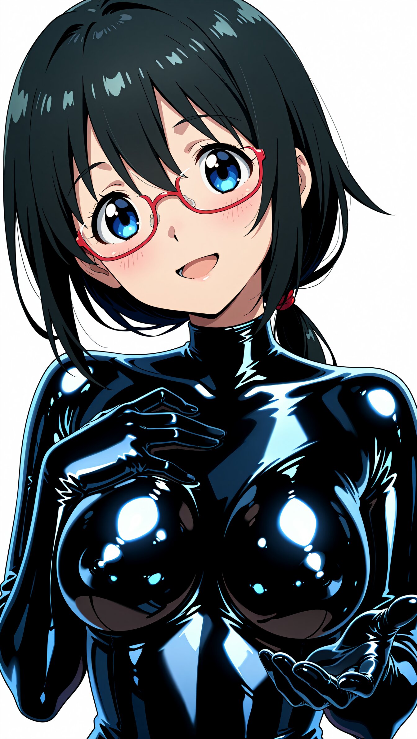 <lora:MeMax6-noob-vpred:1>,memaxl6_a,memaxl6_b,memaxl6_c,memaxl6_d,memaxl6_e, (10's anime style:1.2), Full HD,32K, 1girl, solo, (from front, pov, upper body, ), looking at viewer, open mouth, smile, (beckoning, hand on own chest), head tilt, medium breasts, (teenage :1.3), (blue eyes), long hair, (long low ponytail:2.0), sideburns, hair between eyes, (((tareme))), (black hair), (beautiful hair), (shiny hair), (medium breasts), slender, blush, black hair tie, red-framed eyewear, square-framed eyewear, shiny clothes:1.8, ((((((black latex bodysuit:1.4)))))), ((black latex clothes:2.0)), (((skin tight))) ,(((tight clothes))), ((((seamless clothes)))):2.0, ((((((((shiny black latex bodysuit, shiny clothes, )))))))), ((black latex gloves)),((((no zippers)))), (covered nipples:1.6), erectile nipples, (simple background:2.0, white background:2.0) masterpiece, best quality, super fine illustration, very aesthetic, newest, hyper detailed, intricate, beautiful, aesthetic, highly decorative, HDR, yume kawaii, ,anime screencap,anime,no gradients, 2D flat design, bold outlines,