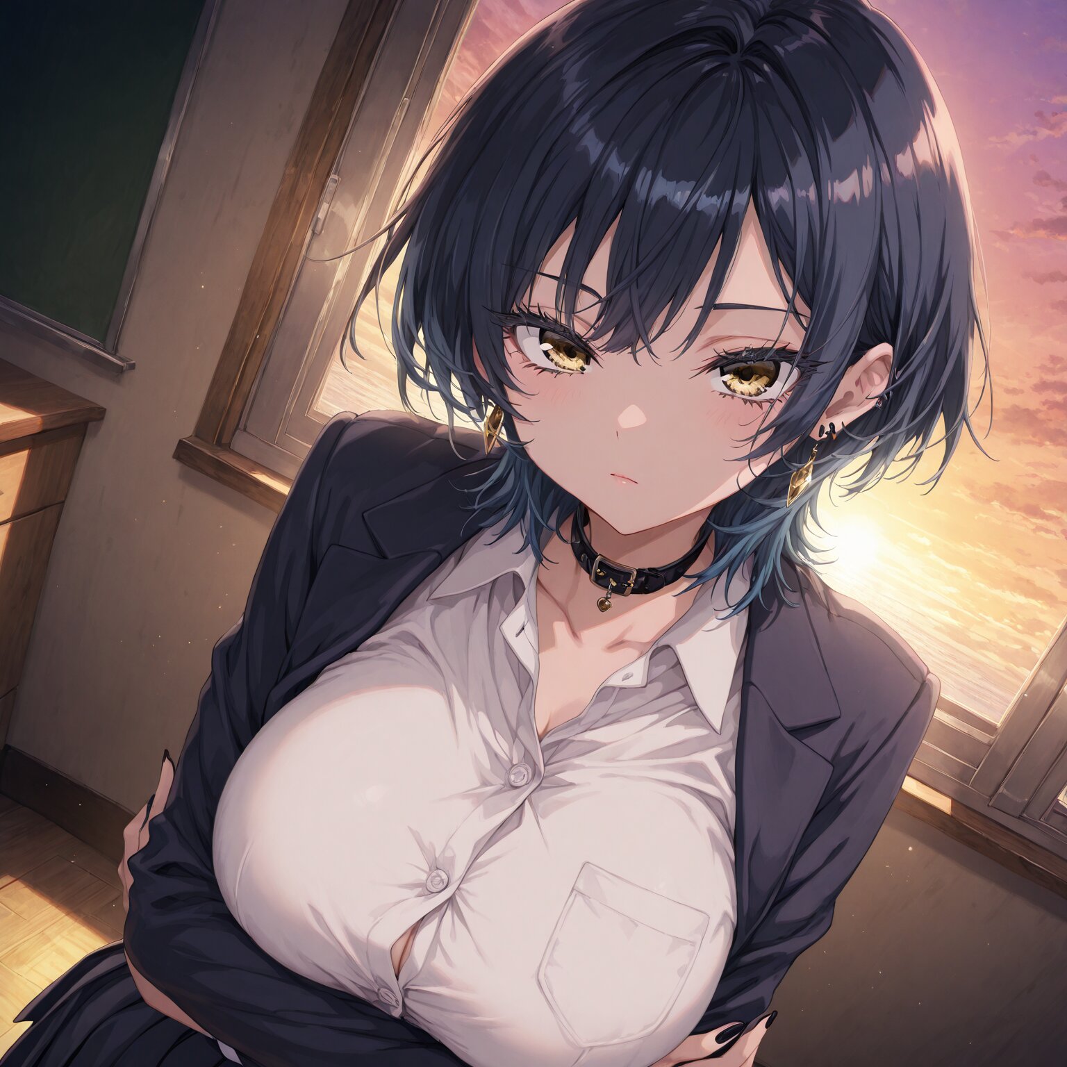 1girl Dark blue hair, wolf cut,long lower eyelashes, sharp eyes, slanted eyes, narrow eyes Locked collar, pointed black earrings, black nails Golden eyes Huge breasts, long breasts, saggy breasts School uniform, blouse, dress shirt, blazer, pleated skirt, Arms crossed, hand touching hair school, evening, indoors BREAK, (newest, anime, animation, anime screen capture, anime style:1.3) BREAK, (masterpiece, , vibrant, very aesthetic, highly detailed, best quality, 16k:1.3)