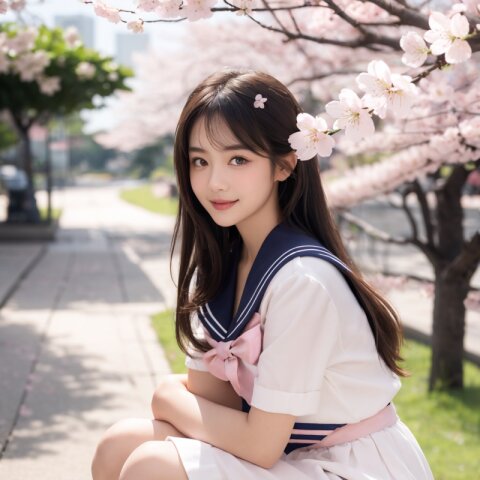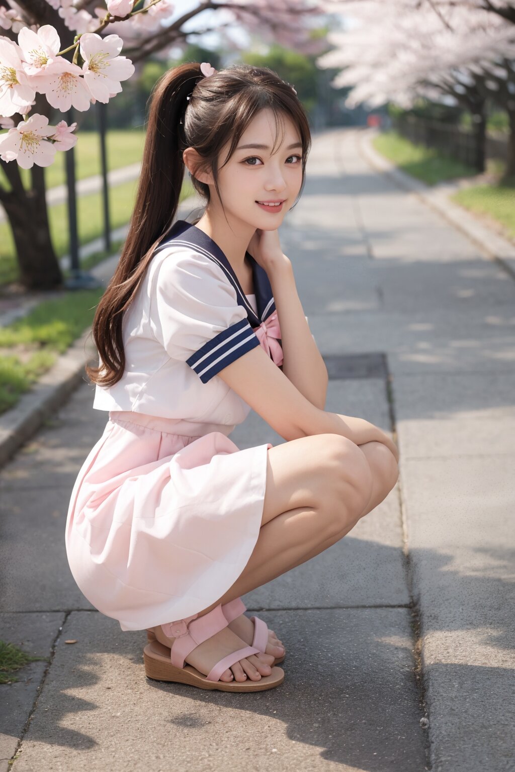 (masterpiece, best quality),(cowboy shot), ((Gentle smile)), looking at viewer, photorealistic, natural skin texture, soft lighting, 85mm lens, shallow depth of field, photo realistic, (masterpiece), (best quality), (superb clarity), ultra detailed, 8k, life-like, cinematic lighting, sharp focus, depth of field,semi backlit, catchlight,reflector effect, BREAK, (Medium Full Shot:1.3),1cute girl ,(((squatting))),shysmile,nose blush,(pony tail),side bangs,fashionable,(A-line outfit),(((white-dress))),(((pastel-pink-sailor uniform))),slimwaist,(stylish open-toe sandals),matching ribbon,lissome figure,dress flattering in the breeze,curious and slightly embarrassed expression,shy smile,nose blush, BREAK,(((Cherry blossom-lined walkway))),(over looking local train),BREAK,(golden ratio beautiful girl),(innocent beauty:0.9),(beautiful girl with a well-balanced childishness and maturity:0.7),(absolute beautiful girl:0.8),almond eye,shapely nose,Ogee curve,best Esthetic line,beautiful face line,small-nosewings,Cupid's Bow Lips,Oval face,beautiful detailed eyes,beautiful detailed hair,shiny skin,