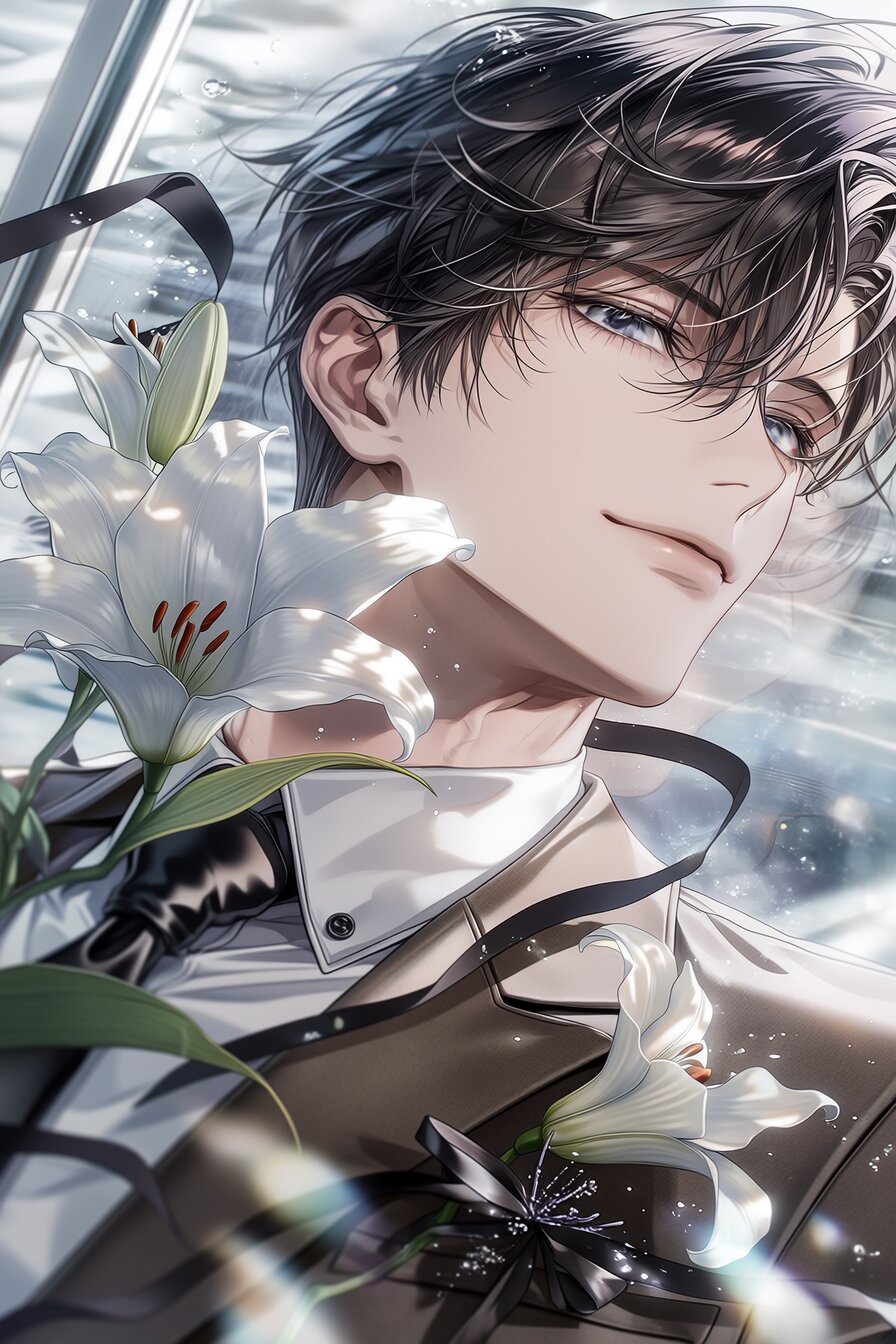 Solo, (masterpiece, highest quality, high resolution, 8k wallpaper: 1.2), very detailed, very detailed (ultra-detailed, sparkling eyes: 1.1), (soft glossy skin) Beautiful young handsome boy elegant calm presence. A gentle yet confident aura. short black hair. Refreshing styling with natural texture. The edges are a little rough, the lashes are long, thin, clear eyes and quiet determination, smooth pale skin, elegant jawline, perfect proportion, brown jacket, custom-made and stylish soft fabric texture and brown pants and beautiful modern silhouette and glossy high-end black leather shoes, Refreshing and sophisticated styling, white lily wrapped in black ribbons, reminiscent of soul rest, (cinematic lighting), (soft focus), bright and gentle airport lighting, soft diffuse light shining on the face and wardrobe. subtle reflection from the surface of glass, tidal effect, flowering, Refined limelight with hair, jacket and flower contours (glowing light: 0.8), composite standing posture, slight third angle, depth of field, rules, gentle blur highlights, transparent and airy atmosphere, emotion sensations and new beginnings, digital illustrations of modern anime travel; quiet excitement and maturity; cinematic but everyday rhythm, Luxury commercial quality character illustrations convey emotion, movement, and sophisticated youth