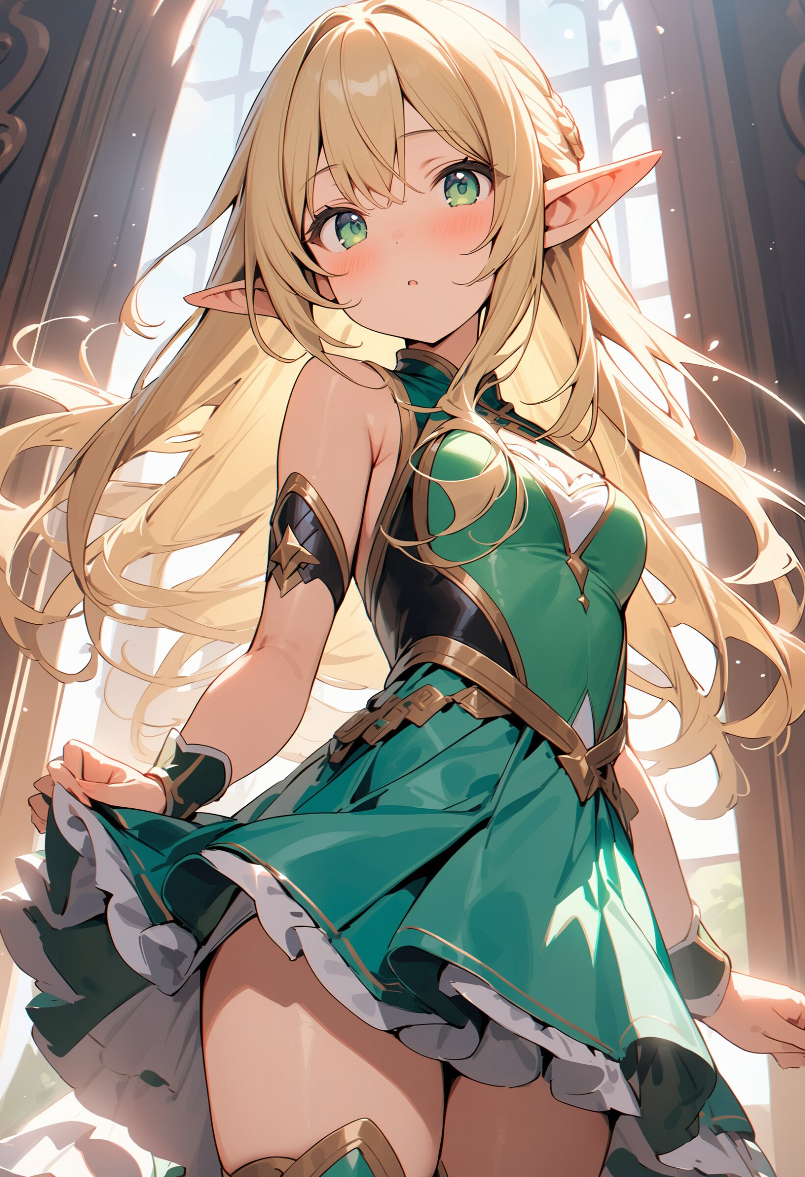 ((masterpiece)), ((best quality)), ((kawaii)), cute, (lovely), ((extremely detailed)), (beautiful), dynamic angle, a cute girl, 1girl, solo, ((elf)),beautiful blond hair, beautiful green eyes, ((beautiful eyes)), long hair, fantasy clothes,