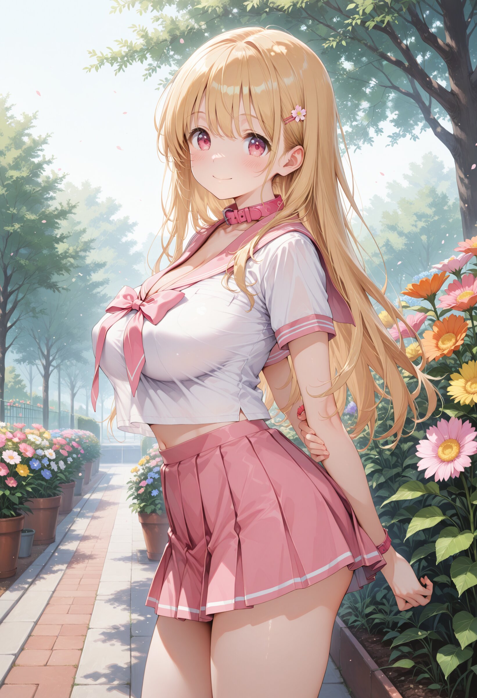 masterpiece, best quality, highres, ultra-detailed, extremely detailed, detailed, 1girl, loli, petite, school sailor uniform, pink collar, pink ribbon, short sleeves, pink miniskirt, blonde hair, long hair, beautiful legs, midriff peek, spring, big breasts, impossible clothes, perky breasts, cleavage between sailor collar, flower garden, from side, look at viewer, , cowboy shot, happy,