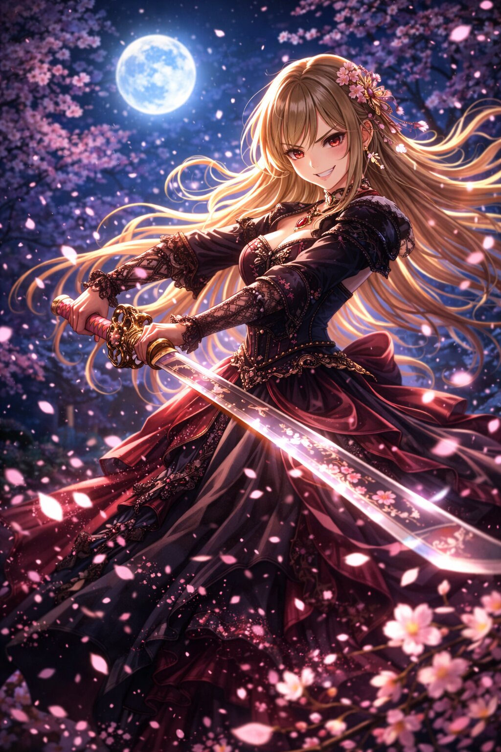 masterpiece, best quality, ultra detailed anime illustration, villainess noble lady, aristocratic villainess, confident smirk, elegant evil smile, dynamic pose, standing under blooming cherry blossom trees, slightly low angle cinematic view, holding sakura themed katana after a powerful swing, long flowing blonde hair glowing in moonlight, golden hair blowing in the wind, red eyes shining, cherry blossom hair ornament, luxurious gothic aristocratic dress, black and crimson elegant ball gown, layered frills, corset waist, lace sleeves, gold embroidery, noble jewelry, dramatic flowing skirt moving in wind, sakura themed katana, elegant curved blade, ornate golden tsuba, pink tsuka wrap, cherry blossom engravings, glowing hamon line reflecting moonlight, night sakura garden, cherry blossom petals swirling like a storm, petals glowing softly, full moon in the sky, moonlight illuminating the scene, cinematic lighting, strong moon backlight, rim light on hair and dress, cool blue night lighting mixed with warm highlights, glowing blade reflections, volumetric light rays through petals, dramatic contrast, anime movie lighting, fantasy aristocrat atmosphere, intimidating beauty, elegant villainess aura, ultra detailed, 8k illustration, vertical composition