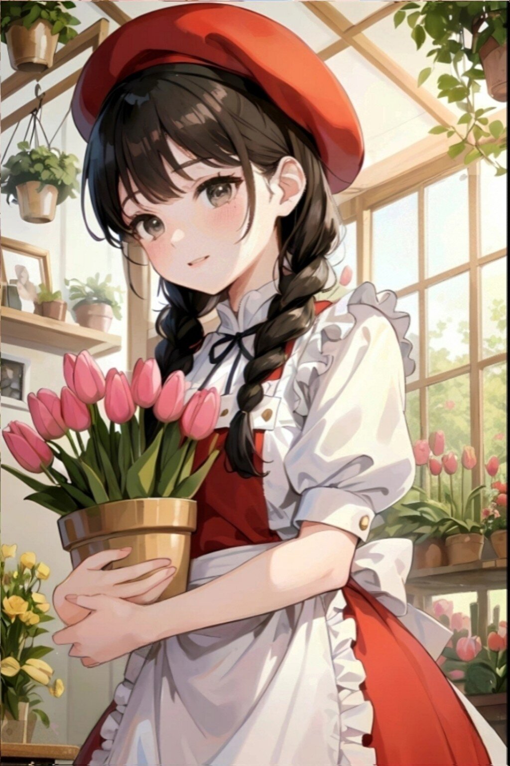 bold composition, bold pose, big movements, headshot, ((A cute girl lovingly holds a potted tulip with a bud)), (((A modern white room from the Meiji period, simple clothing, red beret, black hair, braided pigtails, white shirt with puffy shoulders, red jumper skirt, white ruffled apron)), A girl doll is seated on a shelf on the wall, (((A cute girl gazing lovingly at tulip buds)), Focus on her bright eyes, long eyelashes, and innocent smile that still retains a hint of youth, (((Focus on the girl in a modern style reminiscent of Meiji-era girl's paintings)), A scene of a girl innocently gazing at buds in a white room,