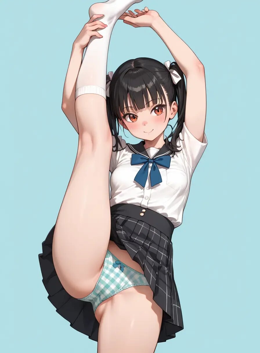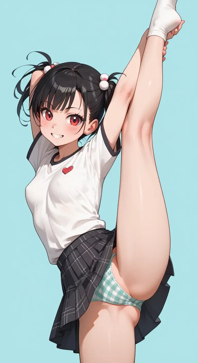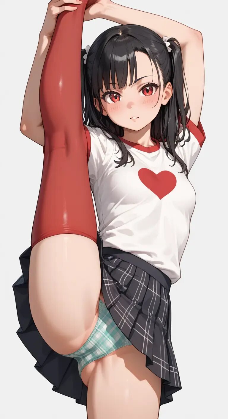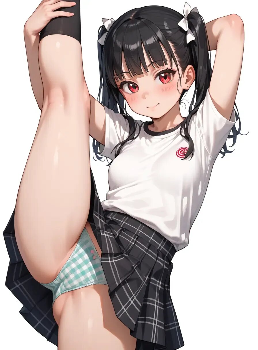 Two Side Up Hair,1girl,loli,bishoujo,mesugaki,underage,black hair,small_breasts,slender_waist,red and white plaid cotton panties, bold black piping trim along the edges, strong contrast outline, soft white side panels, simple casual design, clean shape, anime-style illustration, cel shading, crisp lineart, high contrast colors, minimal background, centered composition, smooth fabric texture, detailed stitching lines,thicker black outline, slightly exaggerated shape,open_skirt