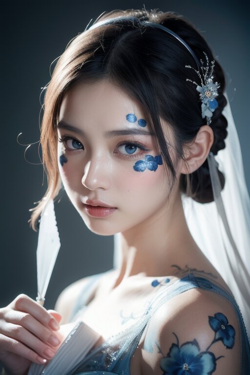 Line art,splatter,minimalist elegance,beautiful blue enchantress rose fairy, Tang Dynasty royal face ancient style beauty, high-definition fashion photography,high-end,ambiguous atmosphere, a woman, painted blue flowers on her face, blue flowers, on her face, looking at viewer, in the style of anime art, luminous and dreamlike scenes, made of crystals, light white and silver, cute and dreamy, in the style of china punk,romantic scenery,animated gift, photo-realistic hyperbole,dark white and dark beige,strip painting, Bright background,detailed depiction, Delicate face and costume details, lifelike appearance HD 16K,cinematic lighting, chiaroscuro,Arbitrary view,Medium Shot, hyper realism,Hollywood style,photography,HD Details,Detail Expression,Rich Details,