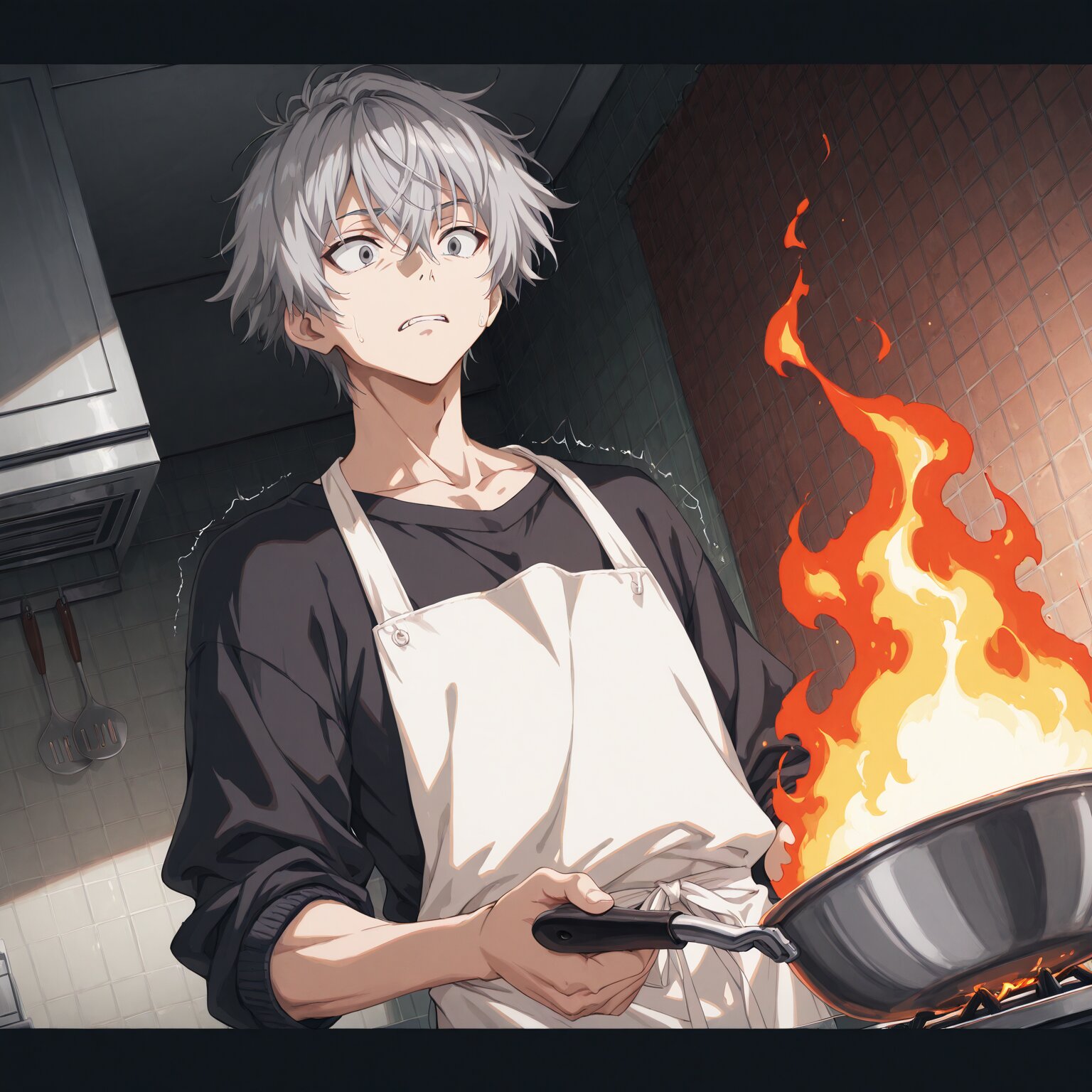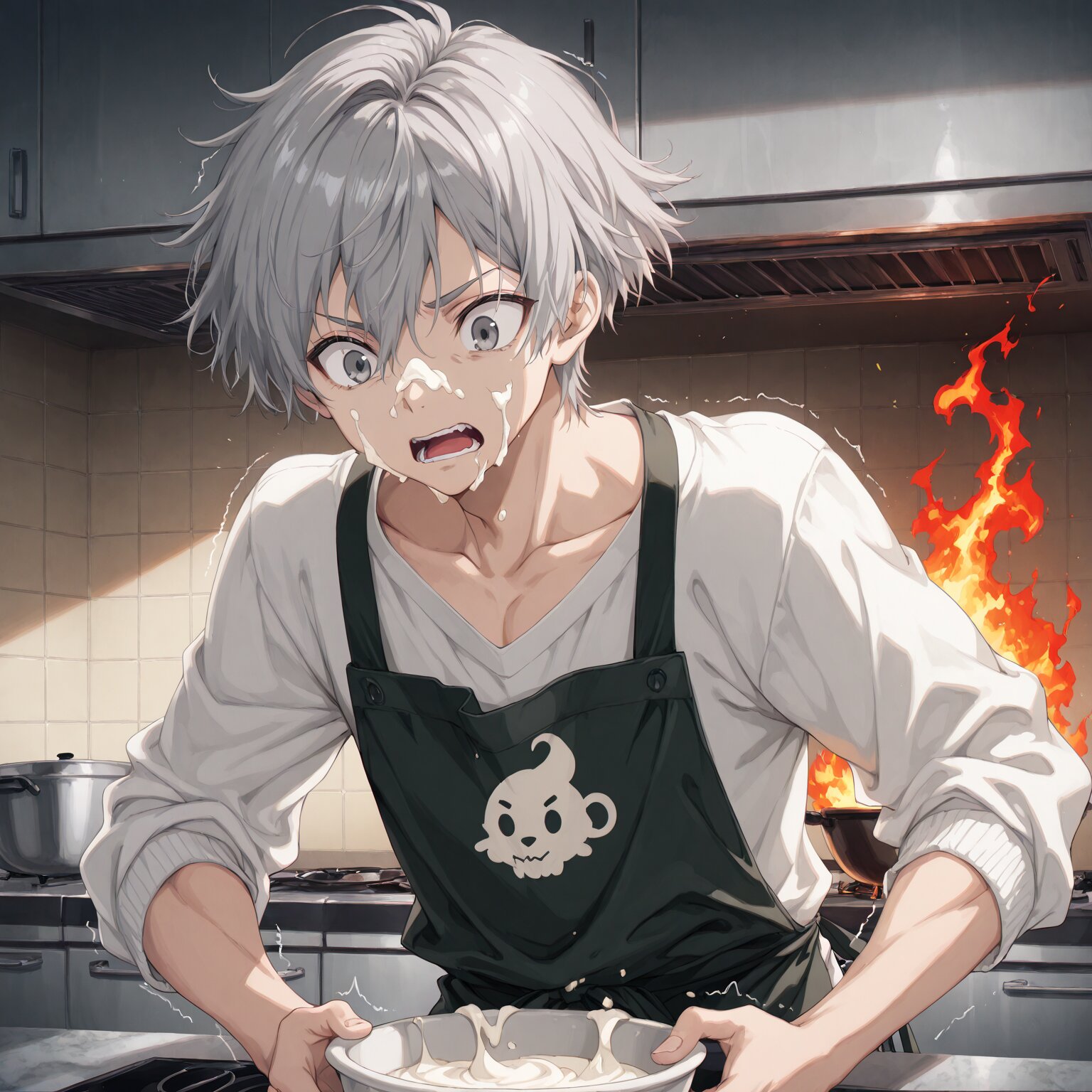 (1boy, male focus), sharp nose, facial muscle, adam’s apple, larynx, flat chest, large pectorals muscle, small arms muscle, male face, male eyes Gray hair, gray eyes, short hair, Straight hair, Put on your sweatshirt, put on your apron, hurry, Rumbling, panicking (grab a bowl, stir the cream), kitchen, messy kitchen, flames coming out of the pot, flames rising from a pot behind me BREAK, (newest, anime, animation, anime screen capture, anime style:1.3) BREAK, (masterpiece, , vibrant, very aesthetic, highly detailed, best quality, 16k:1.3)