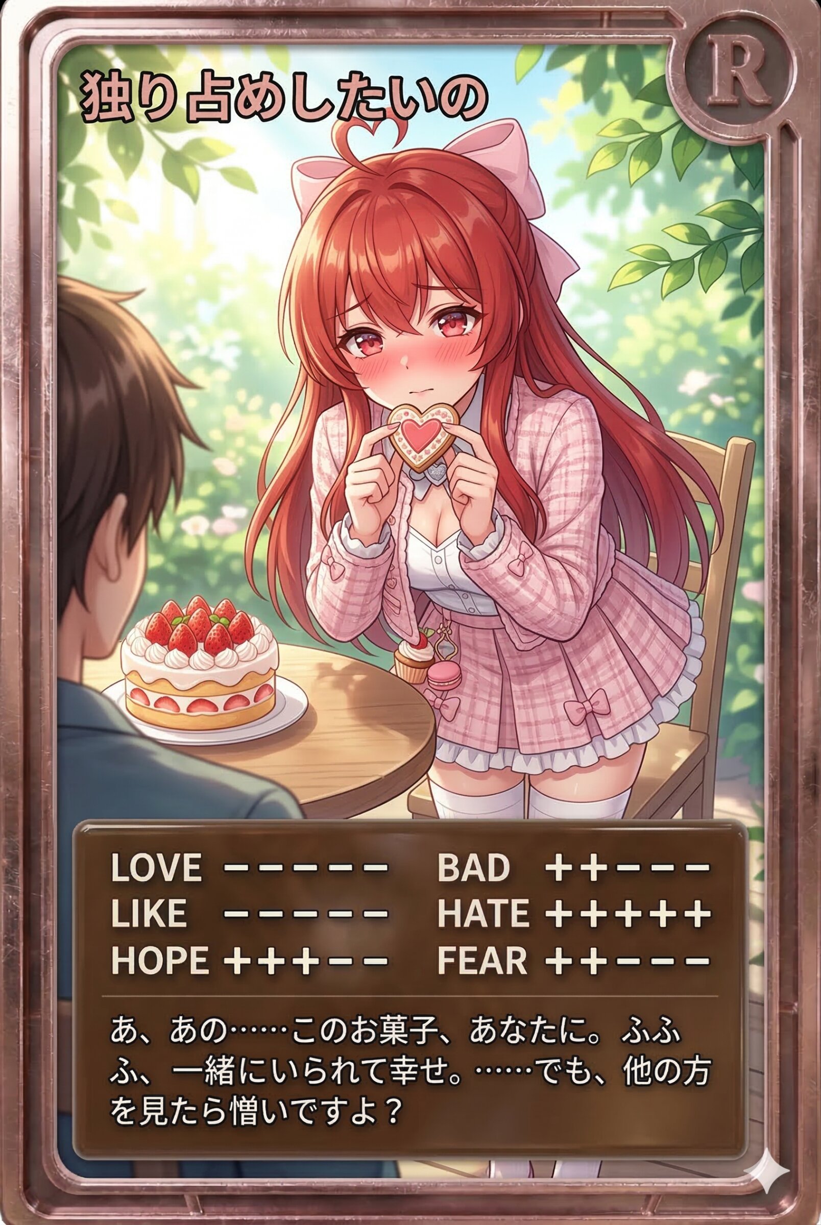 あ、あの……このお菓子、あなたに。ふふふ、一緒にいられて幸せ。……でも、他の方を見たら憎いですよ?