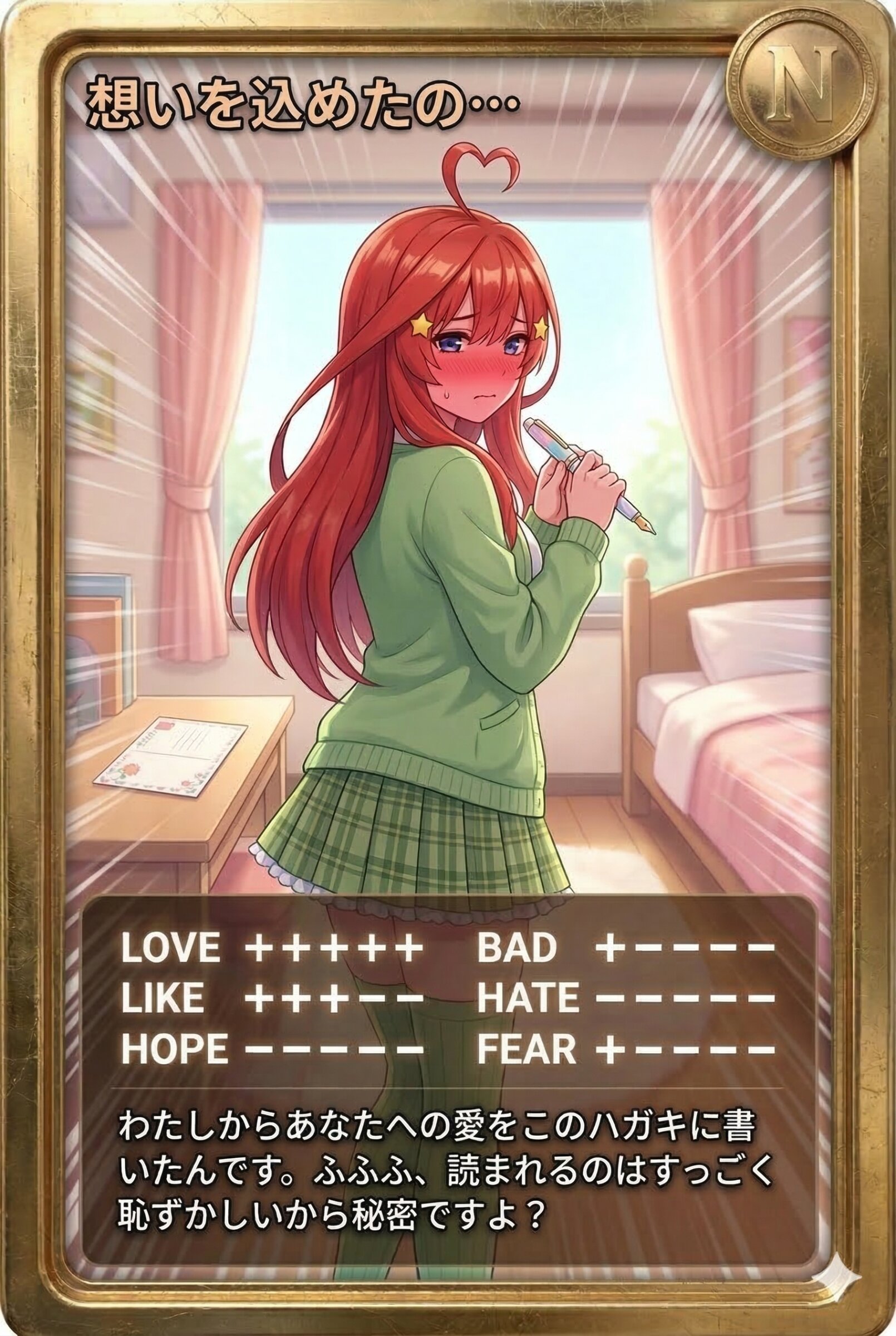 わたしからあなたへの愛をこのハガキに書いたんです。ふふふ、読まれるのはすっごく恥ずかしいから秘密ですよ?