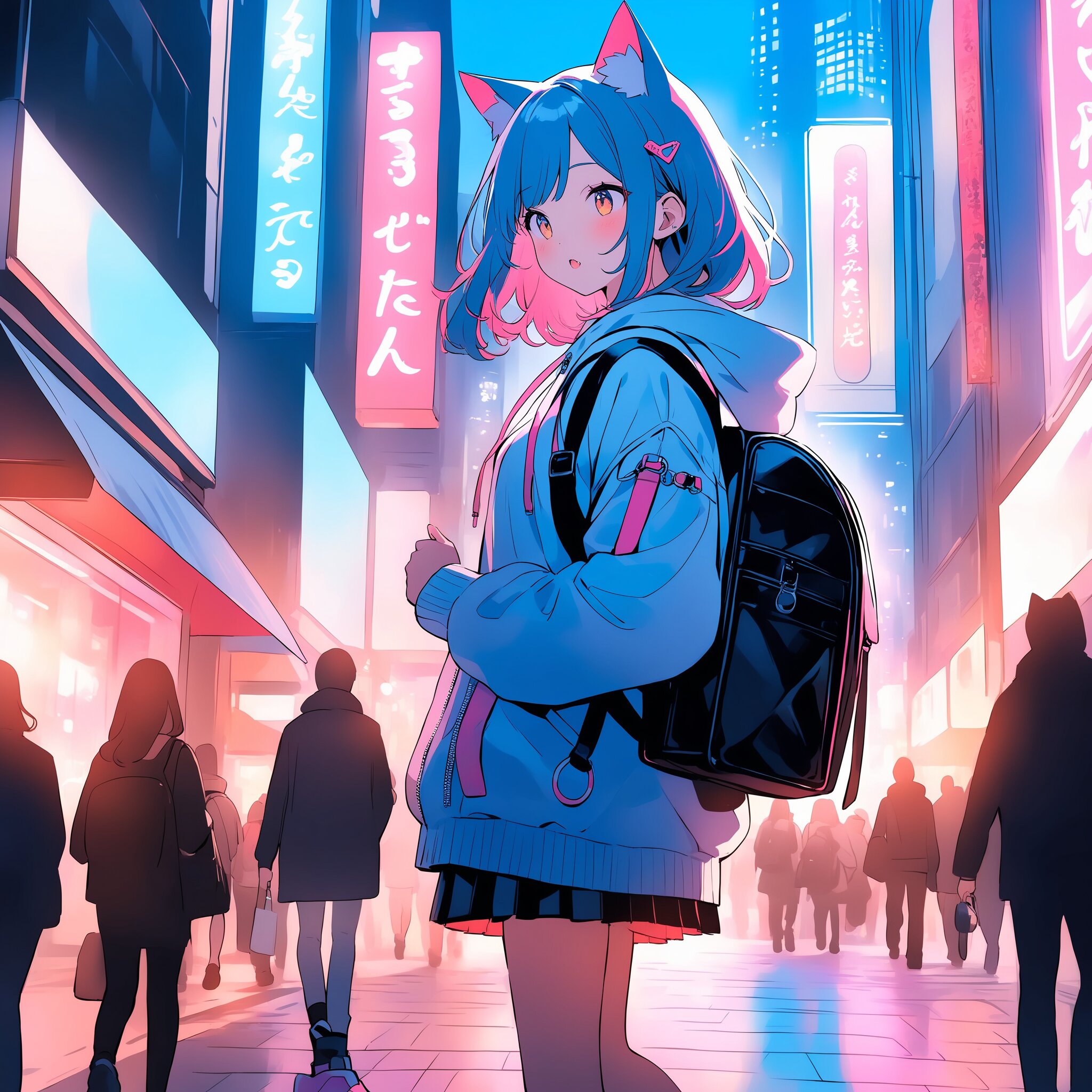 A stylish cat-eared girl walking in a busy Shibuya-style city street, wearing trendy techwear or a street-style hoodie and pleated skirt, sneakers, carrying a small designer backpack, cat ears twitching naturally, neon signs and glass buildings in the background, sunset lighting, street photography style, vibrant colors, sharp focus, masterpiece, high quality.