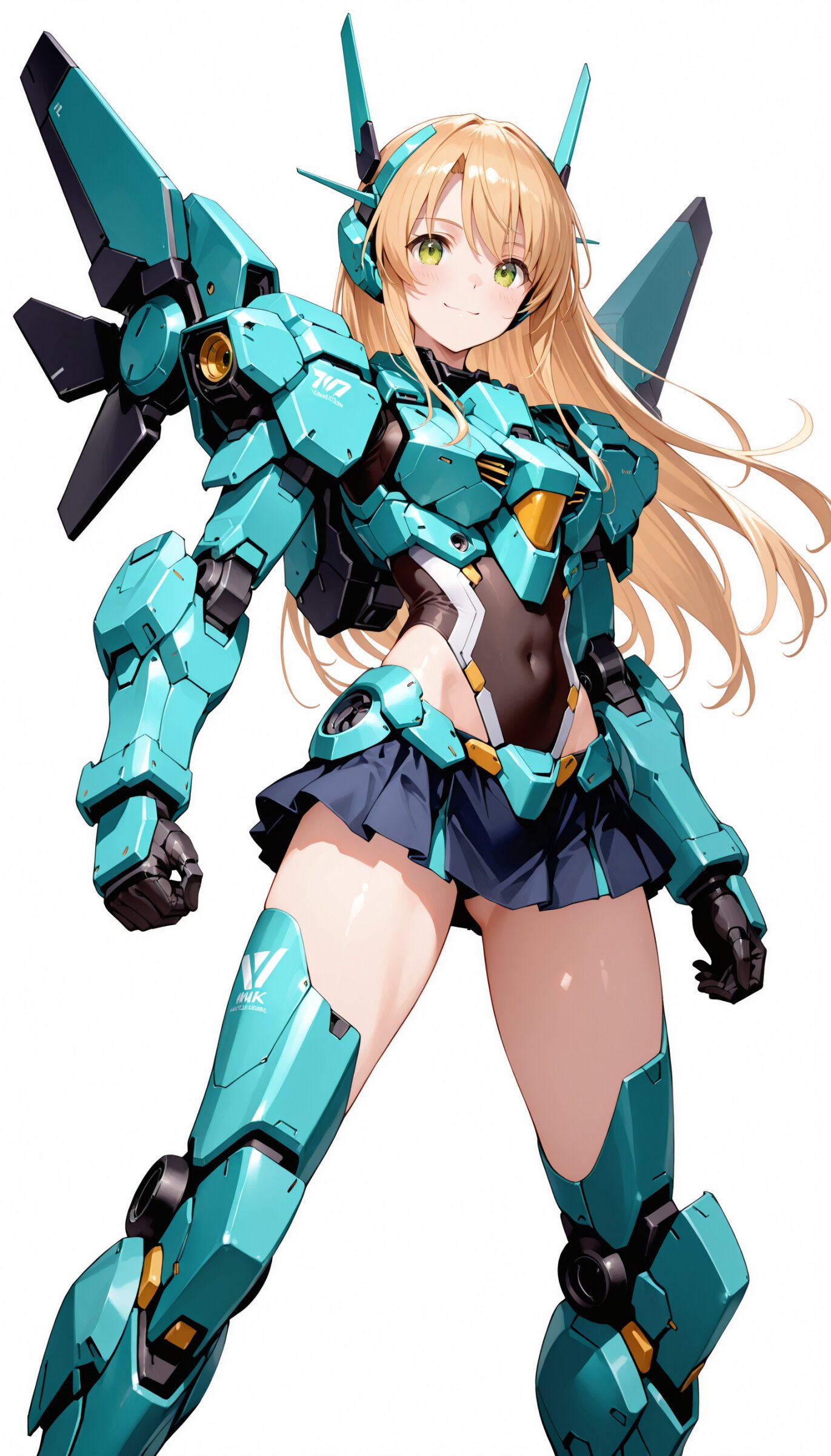1girl, ((white background)), ultra detailed 8k cg render, masterpiece, high resolution, extremely detailed, mecha musume,mecha shoulder, mech leg, headgear, mecha armor, ((mini skirt)),long blonde hair, dropping green eyes, smile, dynamic posing,