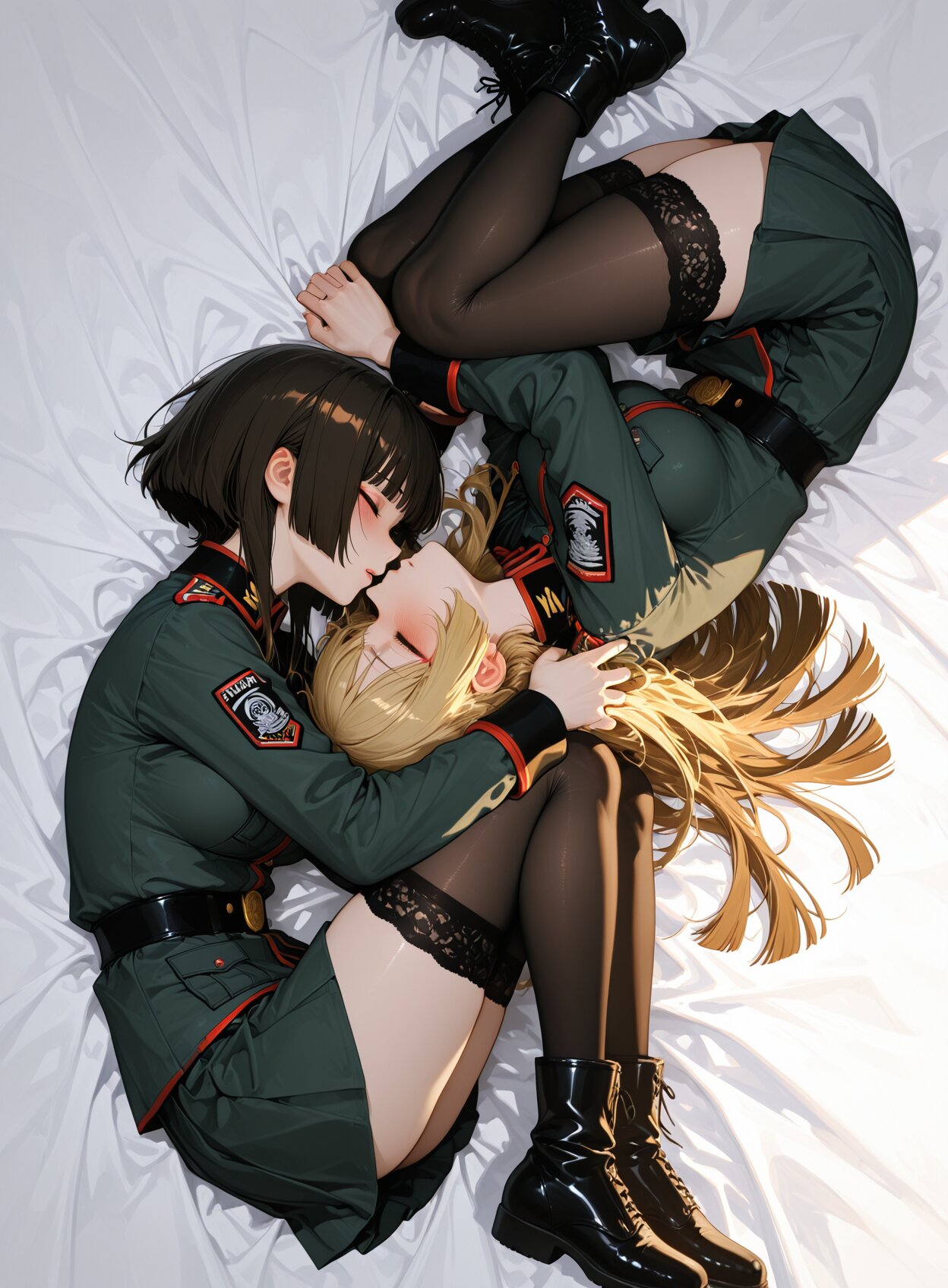 multiple girls, 2girls, perfect anatomy, 8k, high res, ultra detailed, simple background, white background, on bed, makeup, lying, on side, fetal position, detailed black glossy hime-cut, blunt ends, detailde glossy blonde wolf cut, upside-down kiss, kiss, short hair, closed eyes, long hair, yuri, blush, upside-down, shirt, black hair, brown hair, couple, looking at another, blonde hair, from side, imminent kiss, rotational symmetry embroidery clothes, lace decoration, Perfect hand, Detailed hand, girl wear obilonian empire military uniform, obilonian empire, obilonian empire military uniform, full body, breasts, thighhighs, bangs, black footwear, masterpiece, best quality, official art <lora:LoRAUpsideDownKissNoobAIXLvPred:0.84> <lora:Better hands - SDXL v2.0:0.8> <lora:Obilonian_Empire_Military_Uniform_r1:0.69>