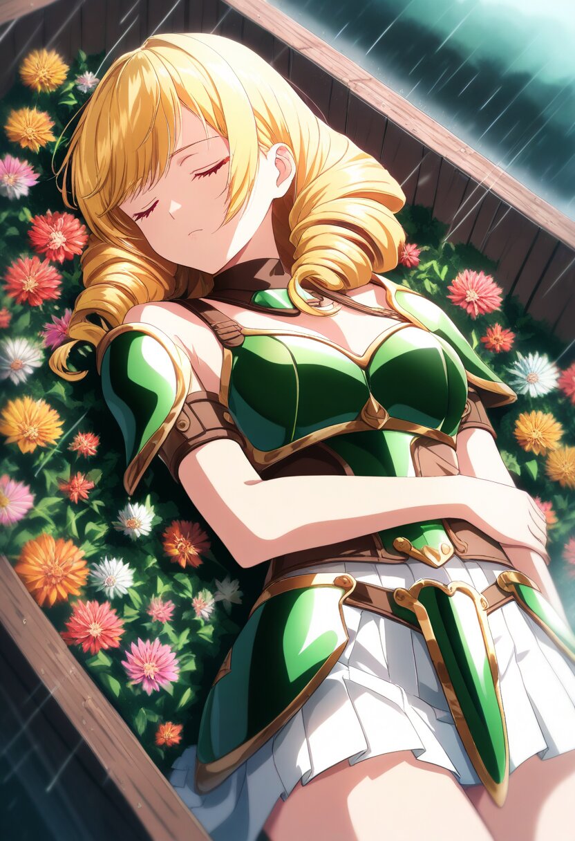 ((masterpiece)), ((best quality)), (ultra-detailed), anime style,cowboy shot,�flower garden, a cute girl in the coffin, ((Green bikini armor )) ,bikini,White Striped, ((pleated skirt)),large bust, heavy rain, beautiful yellow hair, beautiful red eyes, medium hair, drill hair ,((lying on back)) ,(((closed eyes))) , arm across waist
