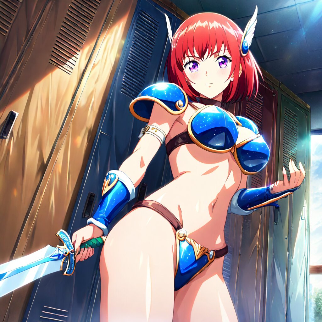 ((masterpiece)), ((best quality)), (ultra-detailed), anime style,cowboy shot,Locker Room, a cute girl, (blue bikini armor) ,large bust, beautiful red hair, beautiful purple eyes, ((beautiful eyes)), short hair, bob cut, Holding a weapon in hand, gripping Sword