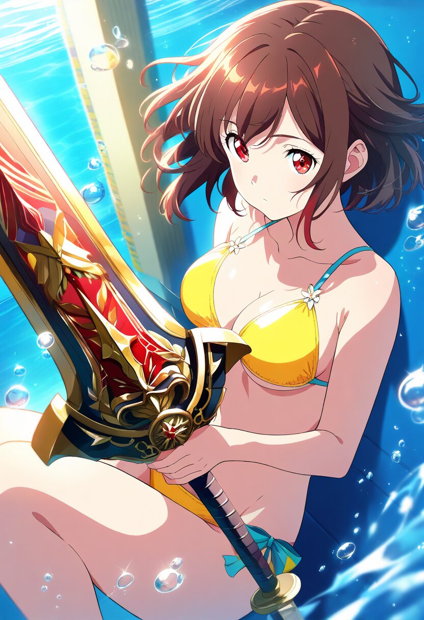 ((masterpiece)), ((best quality)), (ultra-detailed), anime style,cowboy shot, School pool, a cute girl, (yellow bikini),large bust, beautiful brown hair, beautiful red eyes, ((beautiful eyes)), ((short hair)), Holding a weapon in hand, gripping Sword,swimming, on back,diving underwater,hair floating freely, relaxed pose, small bubbles