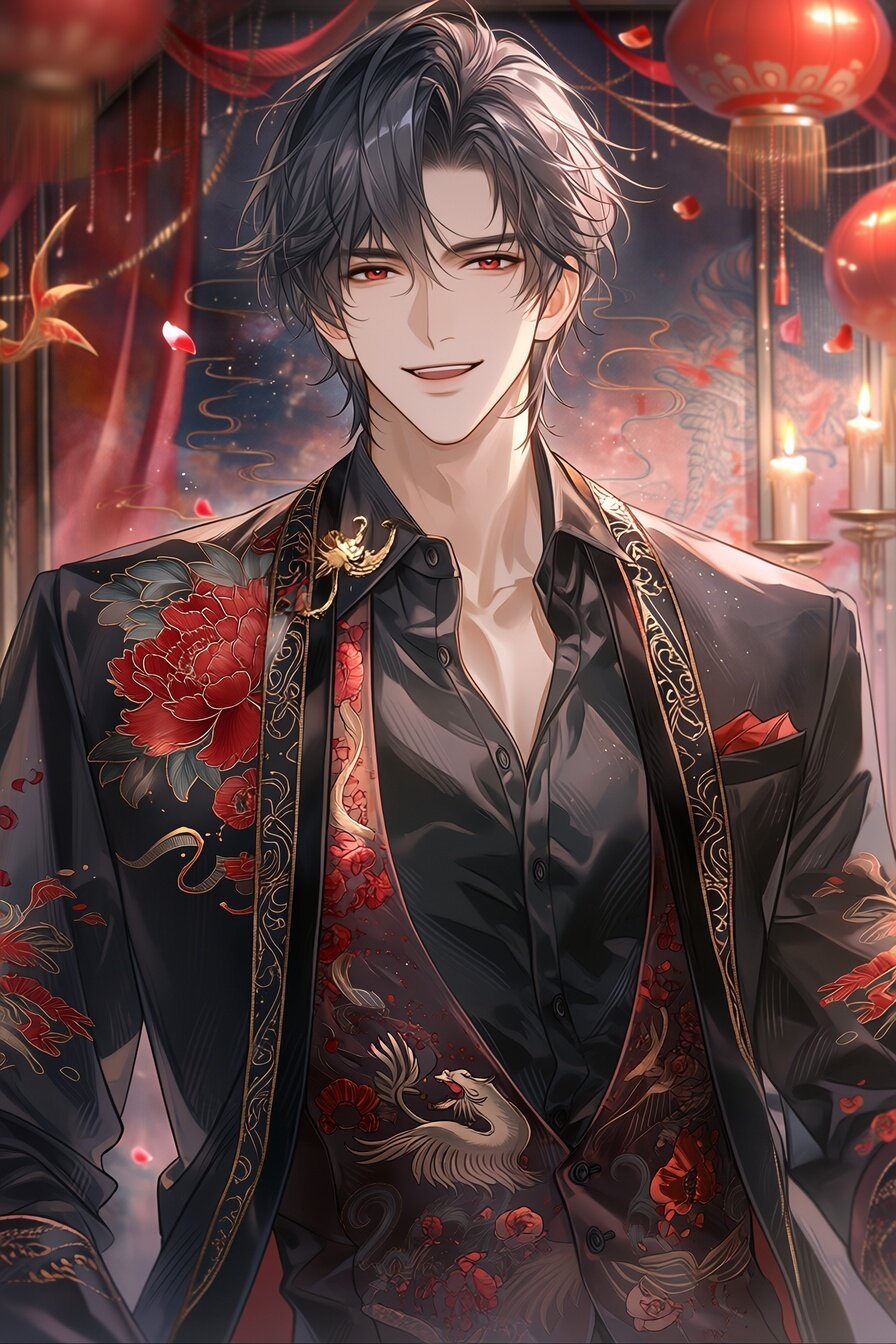 Gorgeous birthday celebration illustration. A dangerously attractive and mature Chinese man, 36 years old. It has a long grayish-black-haired layer, sharp red eyes, and a confident charming smile. He is wearing a gorgeous black suit jacket redesigned for his birthday celebration, decorated with gorgeous red peony embroidery and golden dragon patterns. The cuffs, collars, and edges are richly embroidered with gold thread, crimson flowers, and faint phoenix motifs. The collar has a small elegant golden birthday brooch. He is wearing an open-collar black silk dress shirt under his jacket. A muscular chest that can be seen only slightly from the open collar. The vest under him features complex traditional patterns of birds, fish, and ivy embroidered in red and gold. Background: The atmosphere of China's luxurious birthday party, red lanterns, gold decorations, floating petals, silk curtains, subtle dragon and phoenix motifs in the background. Romantic atmosphere, festive lighting, shining candles, red and gold pallets. Anime style, masterpiece, super detail, high resolution, movie lighting, luxurious atmosphere