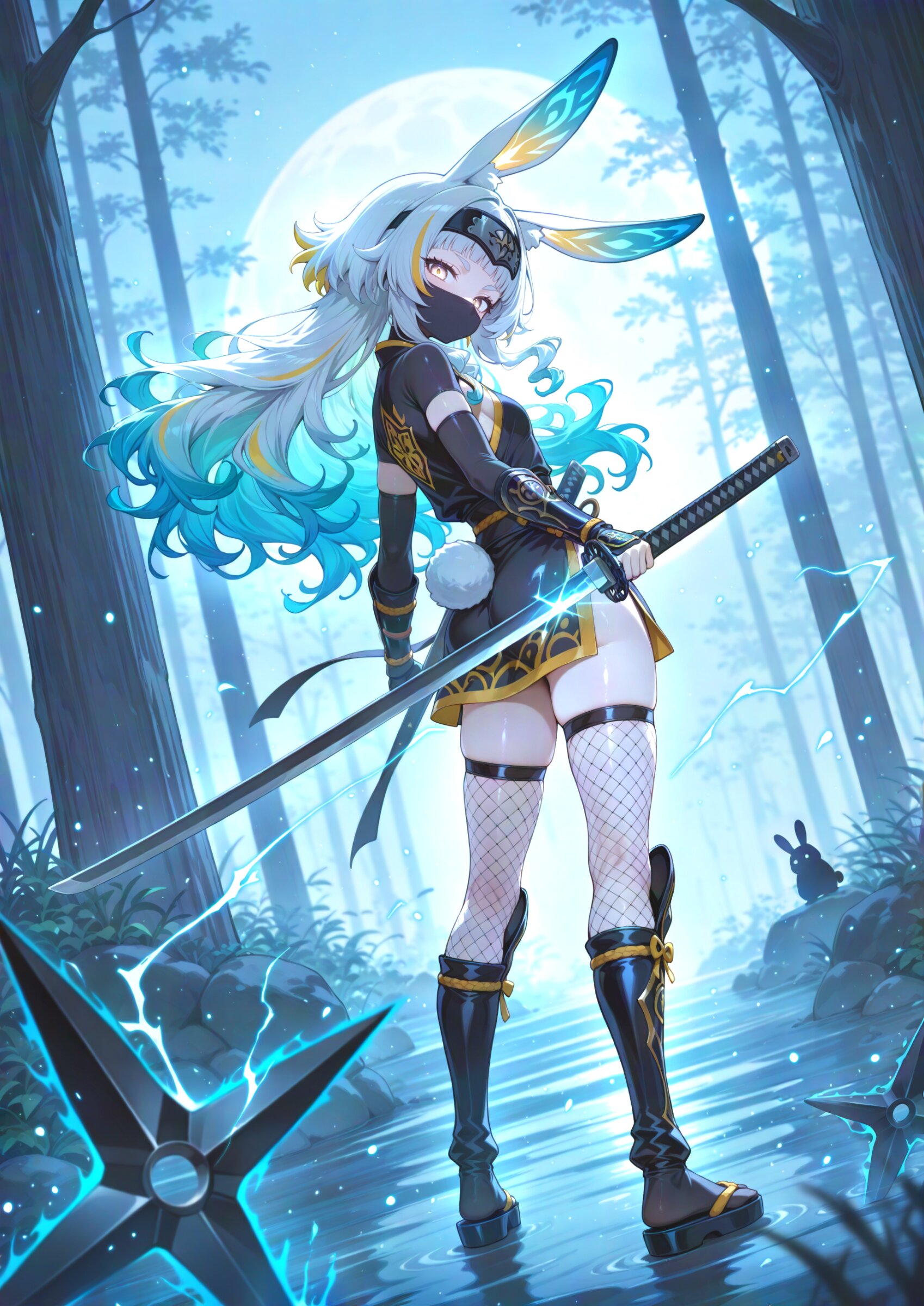 , from behind, thrust out one's hip, looking back, long shot, (blurry foreground:1.1) , (dutch angle:1.2), weapon focus winter atmosphere, earthy color, glowing colorful copper rabbit energy, colorful copper silhouette of serious rabbit guardian, huge rabbit aura, 1girl, samurai, (muscular female:0.65), white hair, cyan streaked hair, highlights hair, chest length hair, wavy hair short bangs , skinny hair, solid circle eyes, beautiful beige eyes small breasts, ,, ninja cloth, short kimono, obijime, fishnet inner, fishnets, fishnet thighhighs, ninja pants,, kote, (ninjutsu:1.1), (wearing big shuriken:1.1) ninja mask, forehead protector,, cleavage, zouri, , rabbit ears, rabbit tail, ,, japanese clothes, seductive smile, dynamic pose, kung fu attack, kung fu action, kuji-in, ninjutsu, reverse grip, raijin, lightning, lightning strike, (swirling ink effects:1.2) blocking, beautiful metallic luster, sharp katana, ultra detailed colorful copper katana, silver particles, light trail, The background is a solid, bright colorful copper, creating a striking contrast with the intricate, multi-colored design of the character, (a lot of silhouette:0.0), pop color background, (high saturation:1.2), drop shadow, ink-drenched shadows, solid black shadow blocks, abstract ink swath background, heavy chiaroscuro, high-contrast inky shading, negative space, grunge texture, calligraphic strokes, super fine concept art, hard surface, graceful eyes, masterpiece, best quality, amazing quality, very aesthetic, absurdres, newest, professional art lots of details, , overexposure, sumie effect style, 4ur4_illu,shiny, glowing, glowing particles, glowing light particles, light particles, creek, <lora:noline (1):-0.5> <lora:sdxl2-flat2-512b:-0.2> <lora:facelightup_xl_v10:0.5> <lora:V2_yakumo_alchemy:0.5> <lora:Aura_illu:0.1>