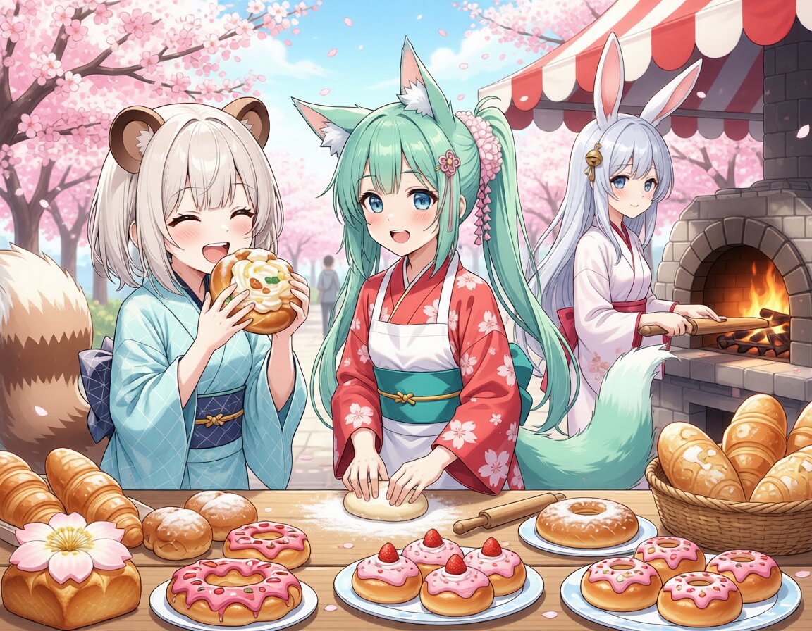 masterpiece, best quality, highly detailed anime illustration, spring bread festival outdoor stall, cherry blossoms petals floating in the air, bright and cheerful spring atmosphere, soft pastel pink white and light blue color scheme left side: cute white-haired bear-eared girl with fluffy tail, blue eyes, long white ponytail, wearing light blue checkered kimono, happily stuffing her face with huge melon pan, strawberry cream bun, sakura anpan, mouth full, blissful smiling expression, crumbs on cheeks center: adorable turquoise-haired fox-eared girl with very long twintails, pink cherry blossom hair accessory, red sakura-pattern kimono, large fluffy fox tail, sleeves tucked up, focused but joyful smile, kneading dough or decorating pink sakura buns, workbench covered with croissants, bunny-shaped bread, strawberry danish, various spring-themed pastries right side: beautiful long white-haired rabbit-eared girl, red eyes, bell accessories on long bunny ears, white and red elegant kimono with long rabbit tail, standing in front of traditional stone oven, holding long wooden peel, pulling out freshly baked round breads (anpan, melon pan, sakura buns), steam rising, proud and satisfied gentle smile background: cute festival banner saying “春のパンまつり” and “Spring Bread Festival”, cherry blossom trees, wooden food stalls, baskets overflowing with bread, piles of strawberry-topped pastries, sakura-decorated buns, small bunny and bear mascot breads, warm spring daylight, soft lighting, delicious food focus, vibrant and appetizing textures, cozy and heartwarming mood anime style, ultra detailed, vivid colors, foodporn, spring vibes, masterpiece, best quality
