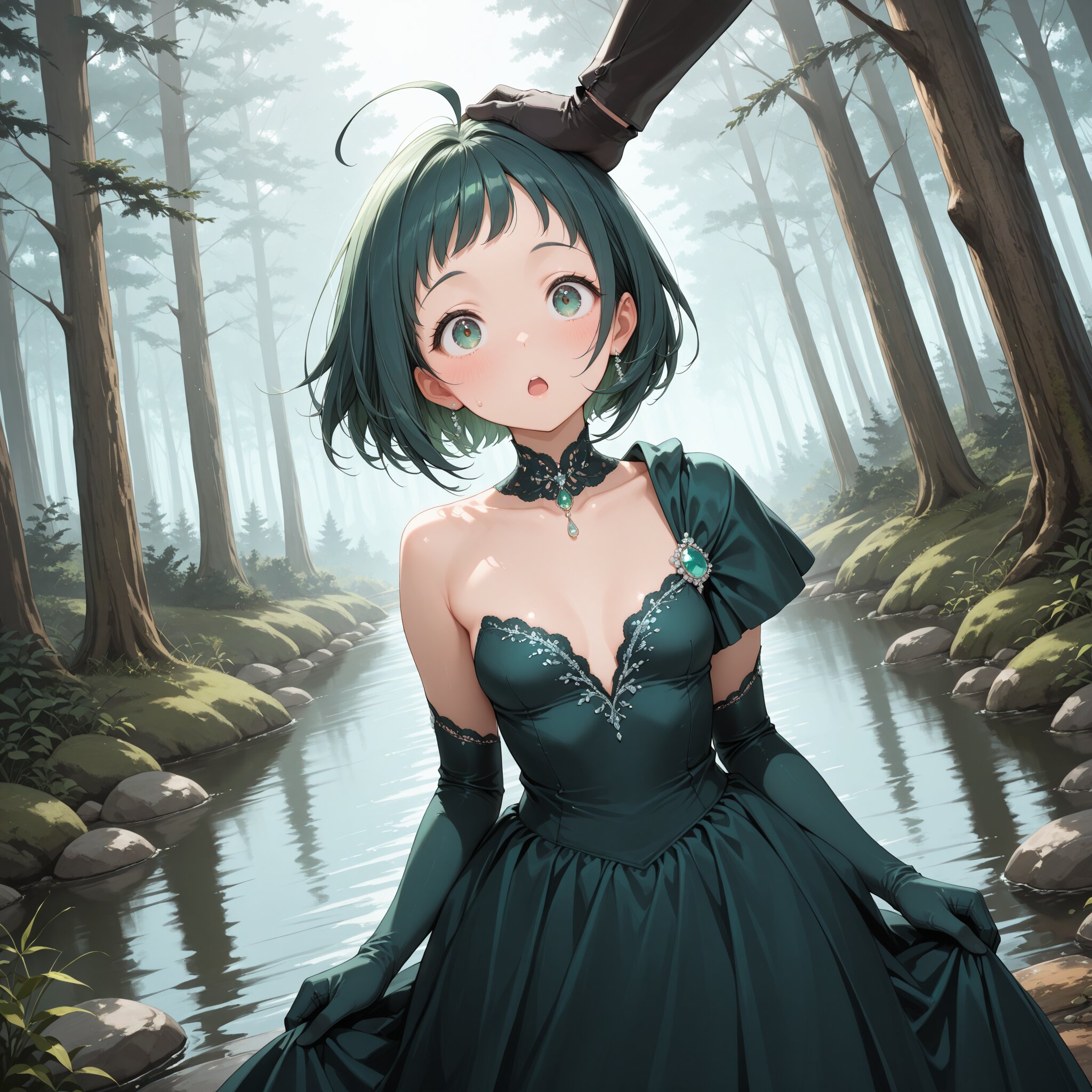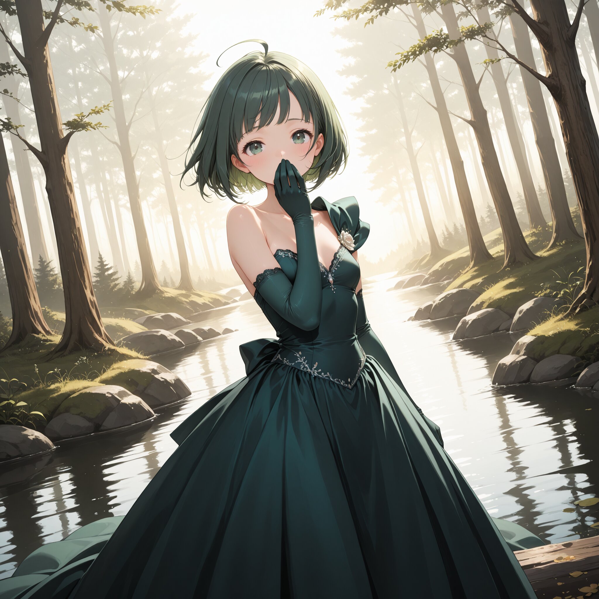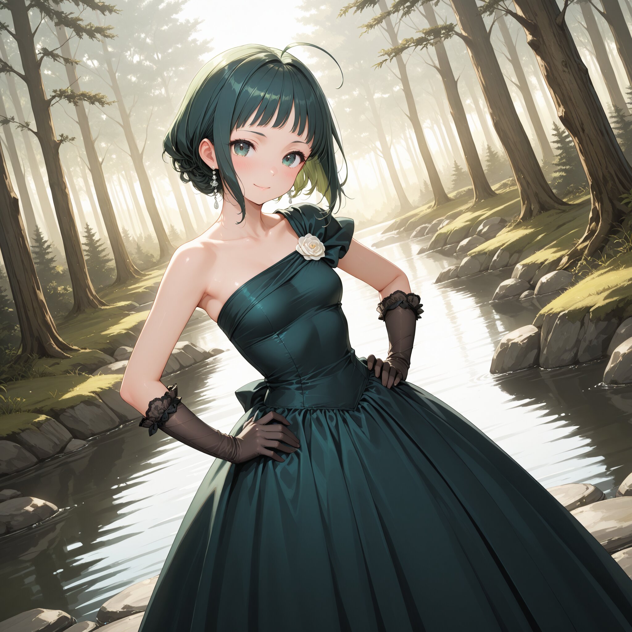 Masterpiece, top quality, amazing quality, very beautiful, exquisite skin detail, attractive high resolution, exquisite detail, 8K, (beautiful small breasts), teen, curves, green hair, hairstyle (with bangs, bob hair, ahoge), dark green wedding dress (princess line, full-waisted dress, one-shoulder, rich ruffles), dark green wedding gloves, woman's expression (scornful expression), background (by a lake in the forest), hands on hips, composition showing the entire dress, cinematic lighting, dutch angle, pov shot