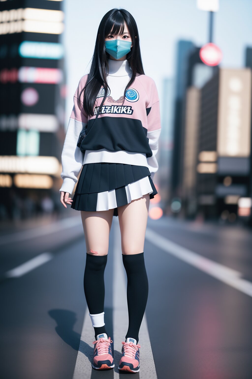 masterpiece, hyper detailed, 8K, hyper detailed illustration, BREAK Japanese woman, 23yo, (cute:1.1), (pretty:1.1), hyper detailed face, hyper detailed eye, beautiful eye, medium hair,bangs, thin,tall, perfect anatomy, Pleated Skirts, High Socks, Sneakers, hyper detailed background, city background,hyper detailed, standing, on roof top.