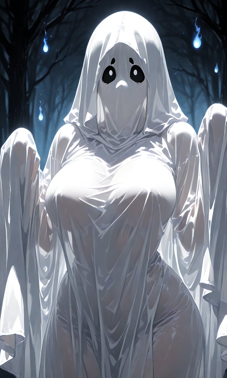 (best quality),(masterpiece),(ultra detailed), ,1 lady, (big breasts, large breasts) ,sheet ghost, solo, ghost costume,