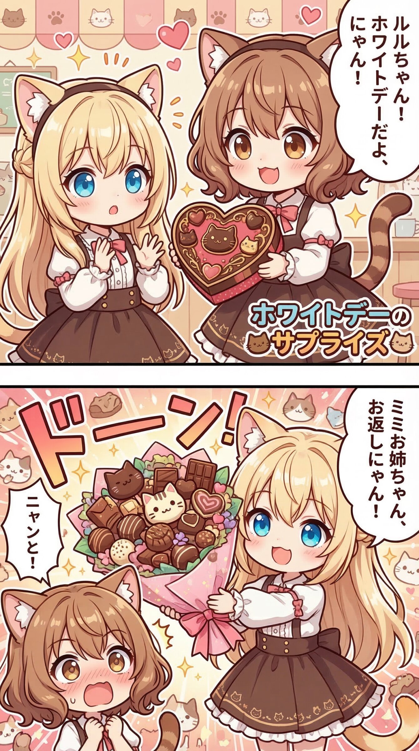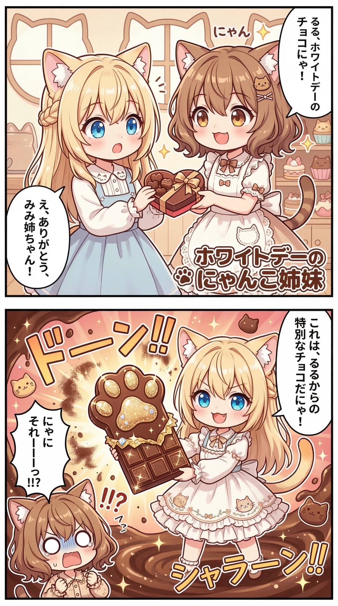 Use the uploaded image as the absolute visual reference for the character's face. Do not deviate from the original design. Based on the character designs in the uploaded image, depict two characters: Mimi and Ruru. Maintain the exact same character design for both. They are sisters. Mimi is the older sister, and Ruru is the younger sister. They have approximately the same height. Character details: Mimi: She has chestnut brown hair, wavy bob hair, hair between eyes, loose inward curls, brown eyes, and cat ears, natural cat tail. Her facial features must remain consistent with the reference. Ruru: She has blonde hair, long hair, braid, hair between eyes, blue eyes, and cat ears, natural cat tail. Her facial features must remain consistent with the reference. Match the art style, and line work of the uploaded image perfectly. 「ホワイトデー」をテーマに、ユニークな2コマカラー漫画を作って。 1コマ目でご機嫌なミミ(右)がルル(左)にインパクトのあるチョコをあげる。 ふたりの上半身のアップ構図。 2コマ目でルルがミミにさらにインパクトのあるチョコをあげる。 インパクトのある演出とエフェクト。 コマの左下隅で驚愕するミミ。 ふたりともシチュエーションに沿った猫っぽい服装とヘアアクセサリーを着用している。 テーマに沿った猫っぽい背景。 セリフやオノマトペはすべて少し猫っぽい日本語。 右から左へ読むことを前提としたセリフ順、キャラ配置。 1コマ目が上、2コマ目が下。 内容に合ったタイトルをつける。 タイトルは内容に沿ったデザインの飾り文字とする。 タイトルは1コマ目内の右下か左下に配置する。