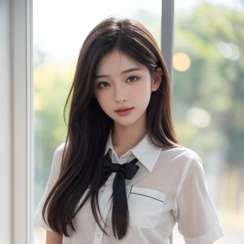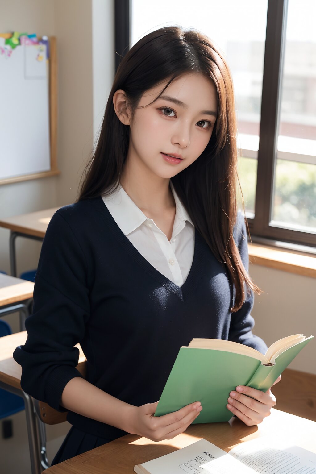 (masterpiece, best quality),(cowboy shot), ((Gentle smile)), looking at viewer, photorealistic, natural skin texture, soft lighting, 85mm lens, shallow depth of field, photo realistic, (masterpiece), (best quality), (superb clarity), ultra detailed, 8k, life-like, soft sunlight, cinematic lighting, shallow depth of field, bokeh, glowing skin, semi backlit, light leak, BREAK (((Medium Full Shot:1.3))),1cute girl,soft brown hair slightly tousled by autumn breeze,(classroom crush:1.0),curious and slightly embarrassed expression,((lissome figure)),(graceful:1.0),(friendly aura:1.0),(her eyes reflecting both nostalgia and quiet determination:1.1),soft glow on her cheeks,(long silky hair),(stylish school uniform), BREAK,(((reading book:1.2))), after school classroom, warm sunlight streaming in, autumnal sunshine,tidy desk, BREAK,golden ratio beautiful girl),(cool beauty), (beautiful girl with a well-balanced childishness and maturity:0.7), (absolute beautiful girl:0.8), almond eye, shapely nose, Ogee curve, best Esthetic line, beautiful face line, small-nosewings, Cupid's Bow Lips, Oval face, beautiful detailed eyes, beautiful detailed hair, shiny skin, BREAK, warm, sentimental, cinematic, romantic atmosphere of youth,lens flare,farewell