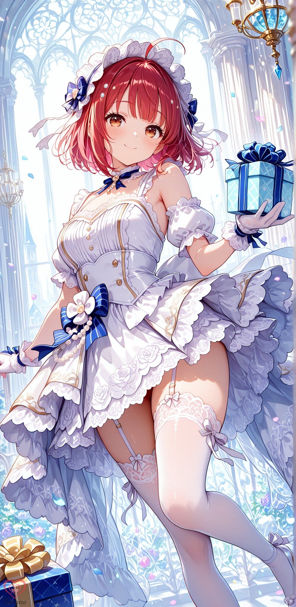 idol-style fitted bodice, elegant structured silhouette, sweetheart neckline, delicate white lace trim, white satin corset-inspired torso, ribbon lacing details, layered white frill accents on the chest, large white bow at the center bust, white pearl buttons, subtle crystal decorations,