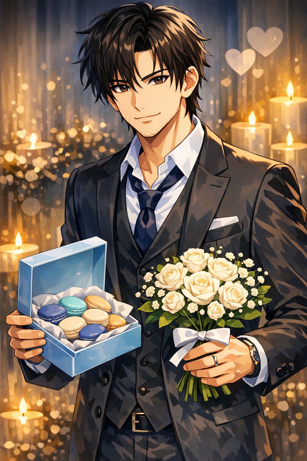 ホワイトデーの雰囲気をまとったアニメ風のイケメン男性。黒髪でスーツ姿、微笑みながらマカロンの入った水色のギフトボックスと白い花束(白いバラとカスミソウ)を持っている。背景はキャンドルの灯りとハートの光がぼんやりと浮かぶロマンチックな空間。