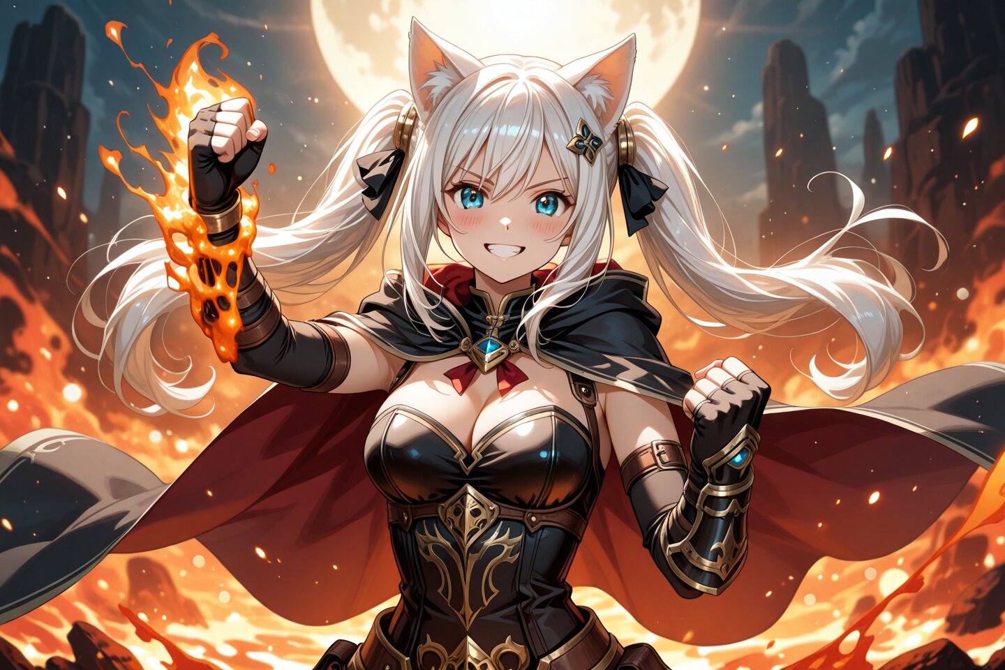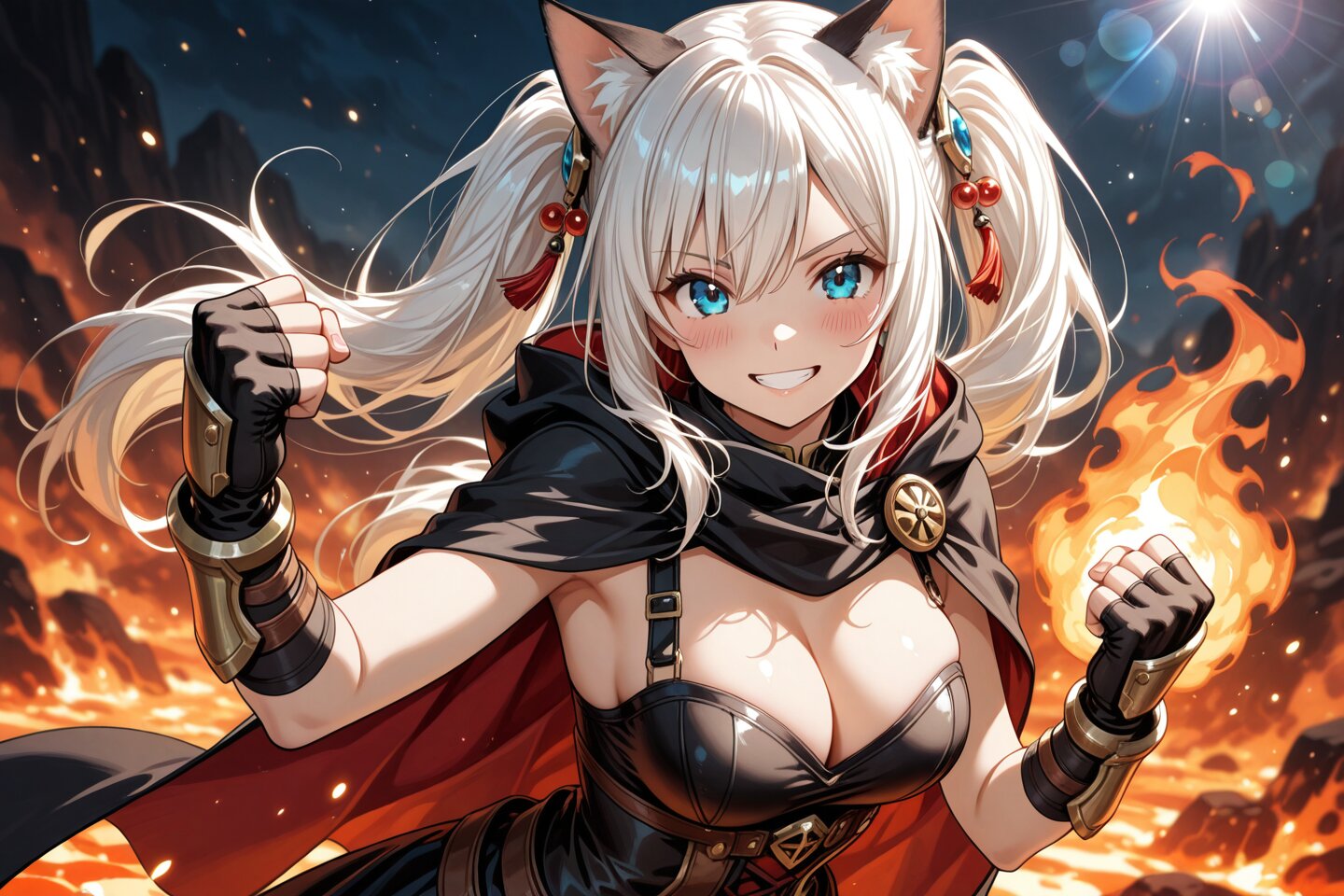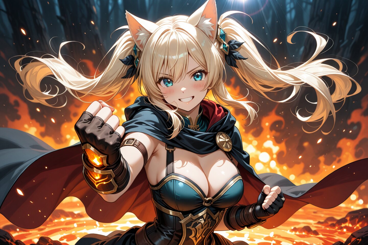 1girl, animal ears, blush, breasts, burning, cape, cat ears, cleavage, embers,fingerless gloves, gloves, hair ornament, long hair, looking at viewer, molten rock, open mouth, grin smile, solo, twintails. Battle pose, clenched fist, upper body, dread daemon lord dress,, anime style, anime color,, <lora:elf-san_alpha1(AnimagineV31):0.7> <lora:elf-san_alpha4(IL1.0):0.7>, nice hand, perfect hand, perfect anatomy, five-fingers,, soft lighting, rim lighting, volumetric light, lens flare, bokeh, ((Countless light particles floating around))