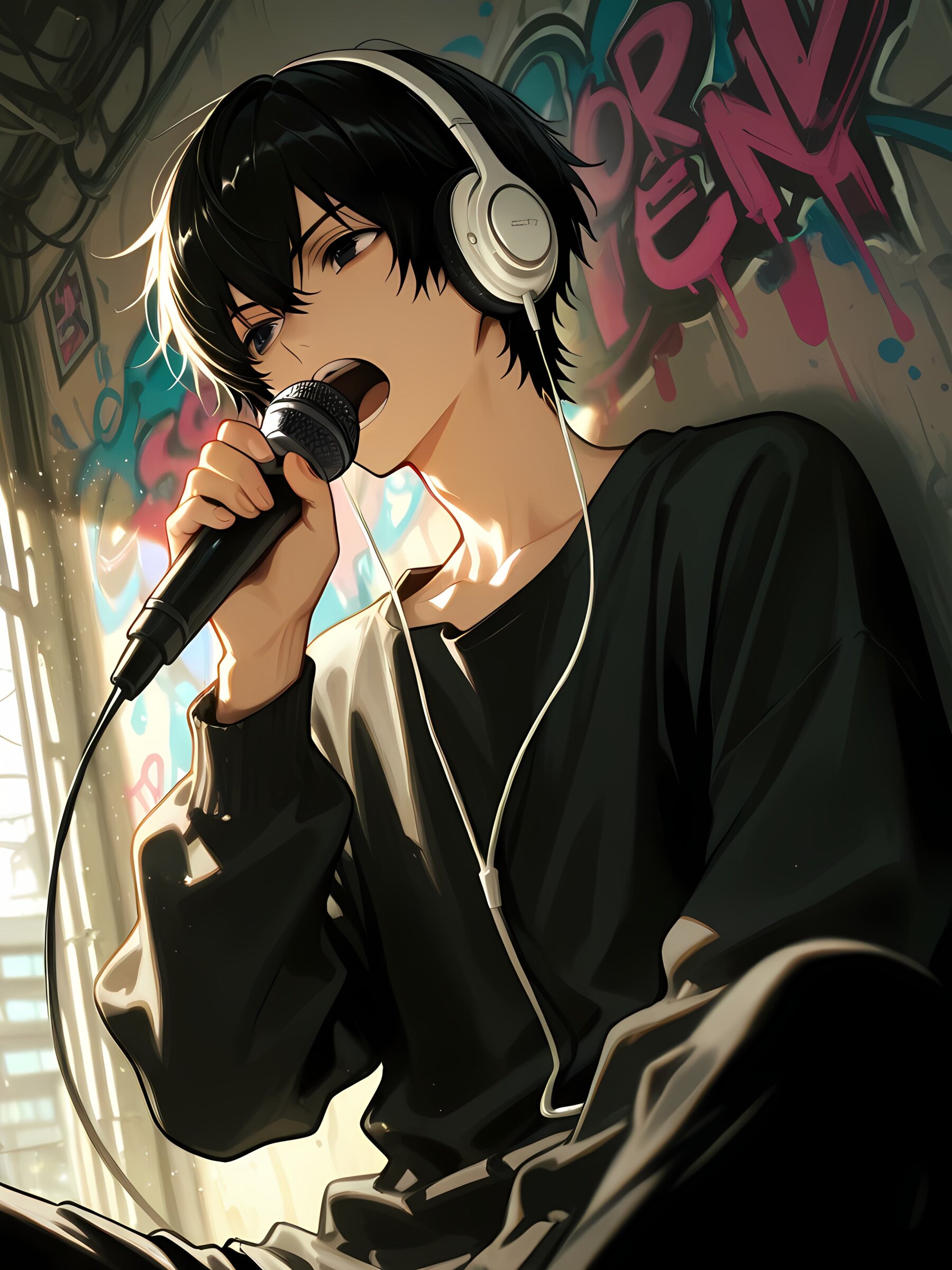 graffiti on background, paint, boy, black hair, black eyes, short hair, solo, headphone, enthusiastic singing, shout, holding mic, sit-down