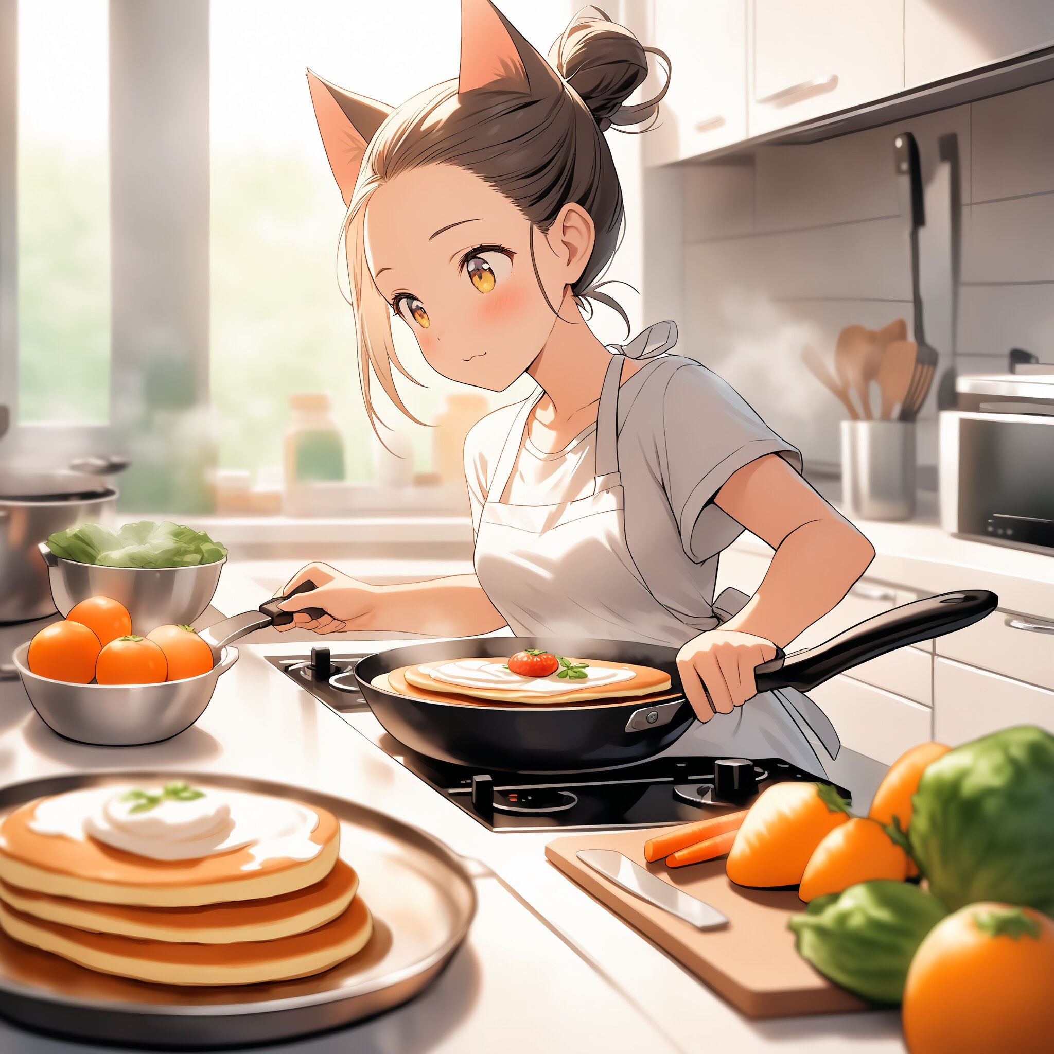 A cat-eared girl in a modern sunlit kitchen, wearing a simple t-shirt and a cute apron, her hair tied back, focused expression as she chops vegetables or flips a pancake in a frying pan, steam rising, kitchen utensils and spices on the counter, bright and airy atmosphere, depth of field, soft focus background, highly detailed, lifelike.