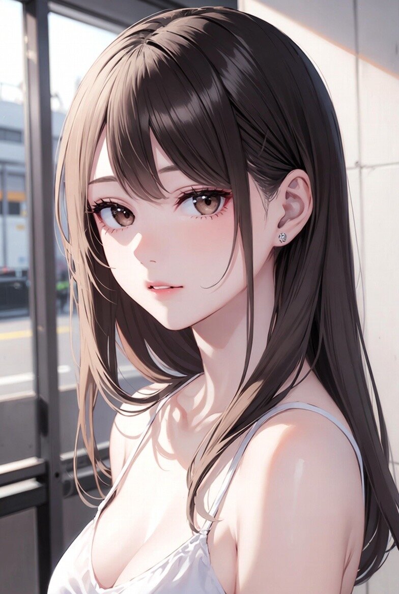 日本人女性23歳の写真。hyper detailed,upper body,cute,pretty。 ロングヘア、姫カット、前髪はbangs。shiny hair。耳には小さなアクセサリー。 thin,tall,perfect anatomy。 白のキャミソールを着ている。背景は日本のバス停。プロのカメラマンによる撮影。