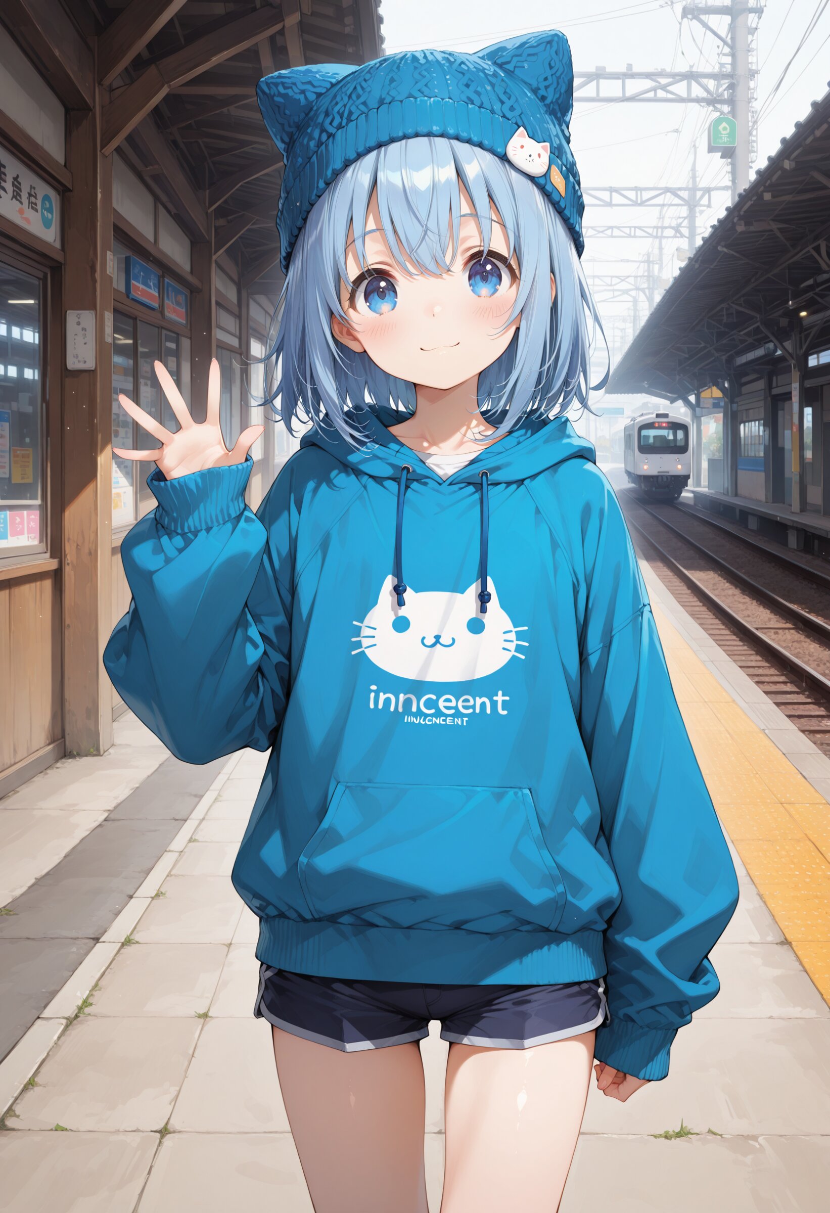 masterpiece, best quality, highres, ultra-detailed, extremely detailed, detailed, 1boy, shota, kawaii, light blue hair, medium hair, blue eyes, cat ear style knitted hat, blue hoodie, short pants, long sleeves, moe sode, Sleeves past wrists, slim legs, station, innocent expression, wave hand, happy, cowboy shot, look at viewer,