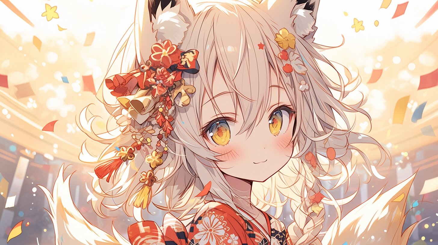 賑やかな祭りの夜、狐耳の少女が赤い着物を纏い、頭に鈴と花を飾って街を駆け巡る。彼女の瞳には星のような輝きが宿り、周囲の紙吹雪が舞う中、失われた古の記憶を呼び覚ますような不思議な出会いが待っている。狐の尻尾を揺らしながら、彼女は夜空の下で願いを込めて鈴を鳴らす。祭りの喧騒の中で、少女の冒険が今、始まろうとしている。