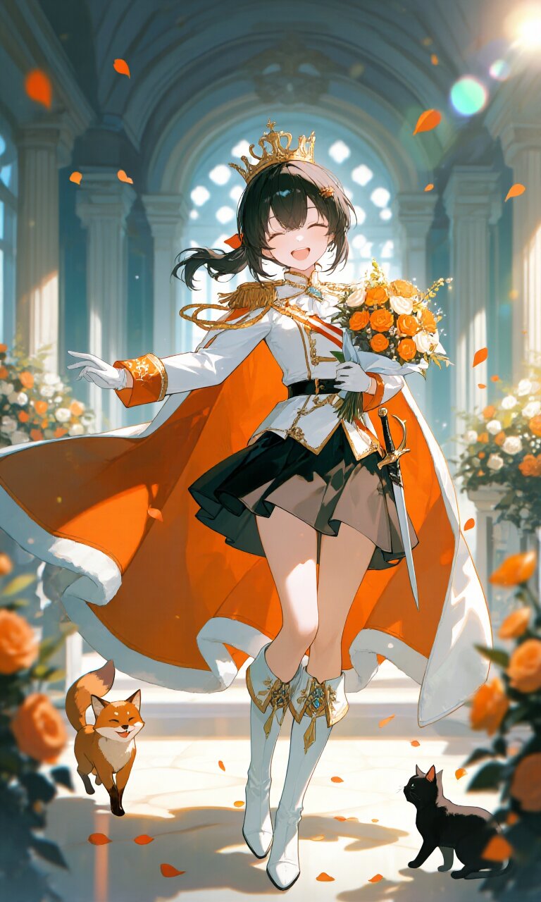 A young, 16-year-old girl with a cute face, bright expressive eyes, and short black hair tied into a single ponytail stands cheerfully in a luxurious ballroom. She wears a (White luxurious Prince costume:1.5) with long sleeves, an (Orange Cape:1.4) flowing behind her, and a (Black mini skirt:1.3) that contrasts elegantly. Her attire is completed with (White luxurious Boots:1.3), a (dagger on waist:1.3), a (luxurious crown:1.3), and (White gloves:1.2). She holds a (bouquet in hand:1.8) of vibrant flowers, smiling happily with closed eyes, radiating joy. Beside her, a small fox cub and a black kitten play at her feet, adding to the heartwarming scene. The setting is a grand (Palace:1.2) with (neoclassical architecture:1.2), adorned with countless flowers and bathed in soft lighting. The atmosphere is dreamy and romantic, with lens flares enhancing the ethereal glow. The composition is insanely detailed, from her delicate skin and flowing hair to the intricate embroidery on her clothes, creating a masterpiece of elegance and charm.