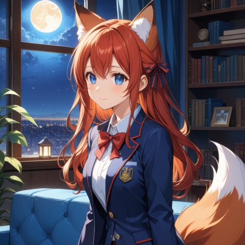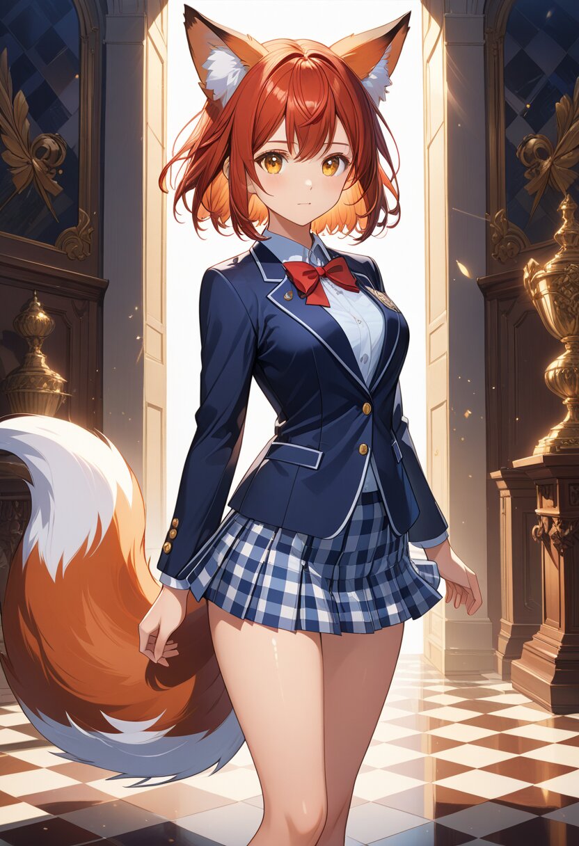 (high resolusion,illustration,ultra detailed 8k art,extremely detailed CG,official art,clothes reflecting light,detailed shiny skin,detailed background:1.3), ((highly detailed beautiful face and eyes),anime_style, red_fox_ears, girl, red_hair, short_hair, double_eyelids, long_eyelashes, navy_blazer, red_ribbon_on_chest, checkered_miniskirt, high_school_student, fluffy_tail, full_body, standing_pose, clean_composition, soft_shading