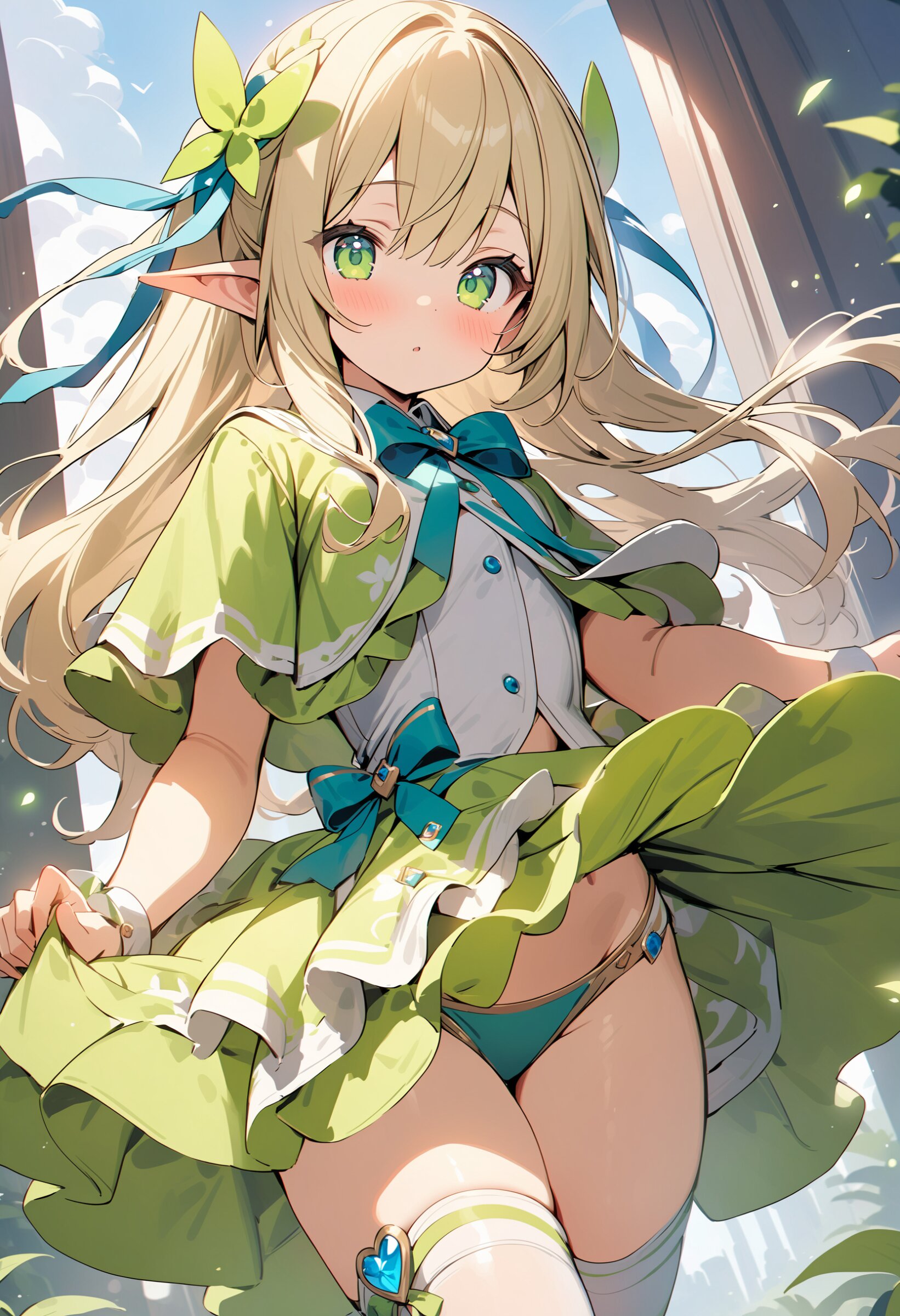 ((masterpiece)), ((best quality)), ((kawaii)), cute, (lovely), ((extremely detailed)), (beautiful), dynamic angle, a cute girl, 1girl, solo, ((elf)),beautiful blond hair, beautiful green eyes, ((beautiful eyes)), long hair, fantasy clothes,