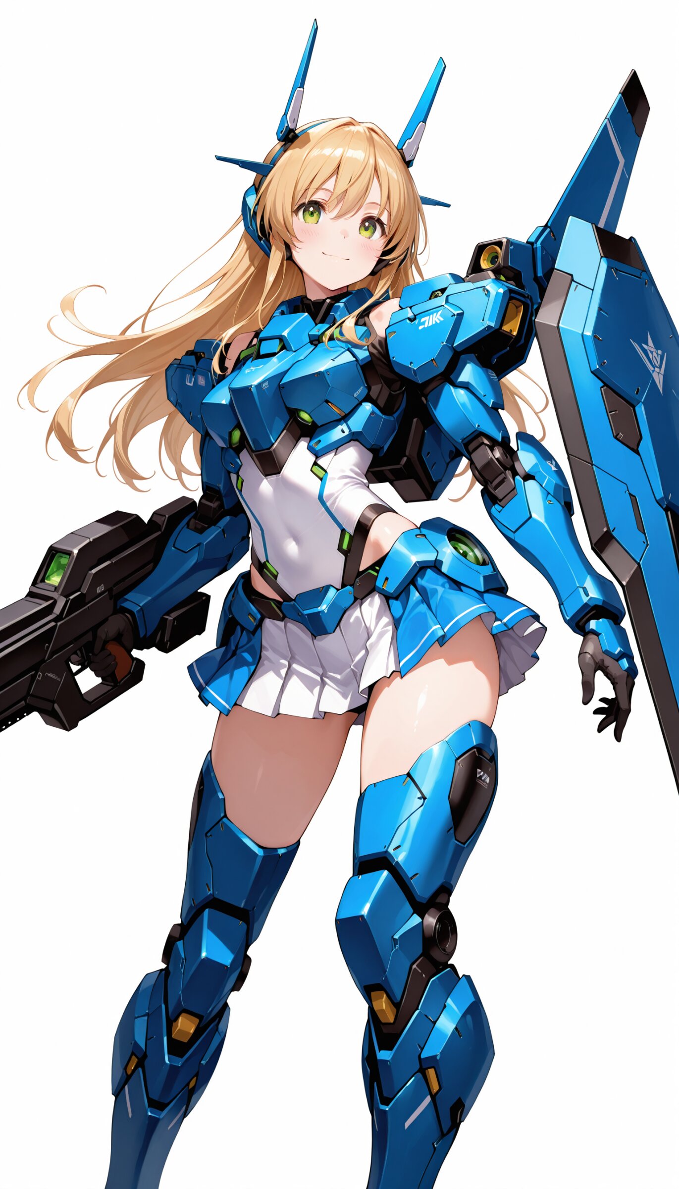 1girl, ((white background)), ultra detailed 8k cg render, masterpiece, high resolution, extremely detailed, mecha musume,mecha shoulder, mech leg, headgear, mecha armor, ((mini skirt)),long blonde hair, dropping green eyes, smile, dynamic posing,