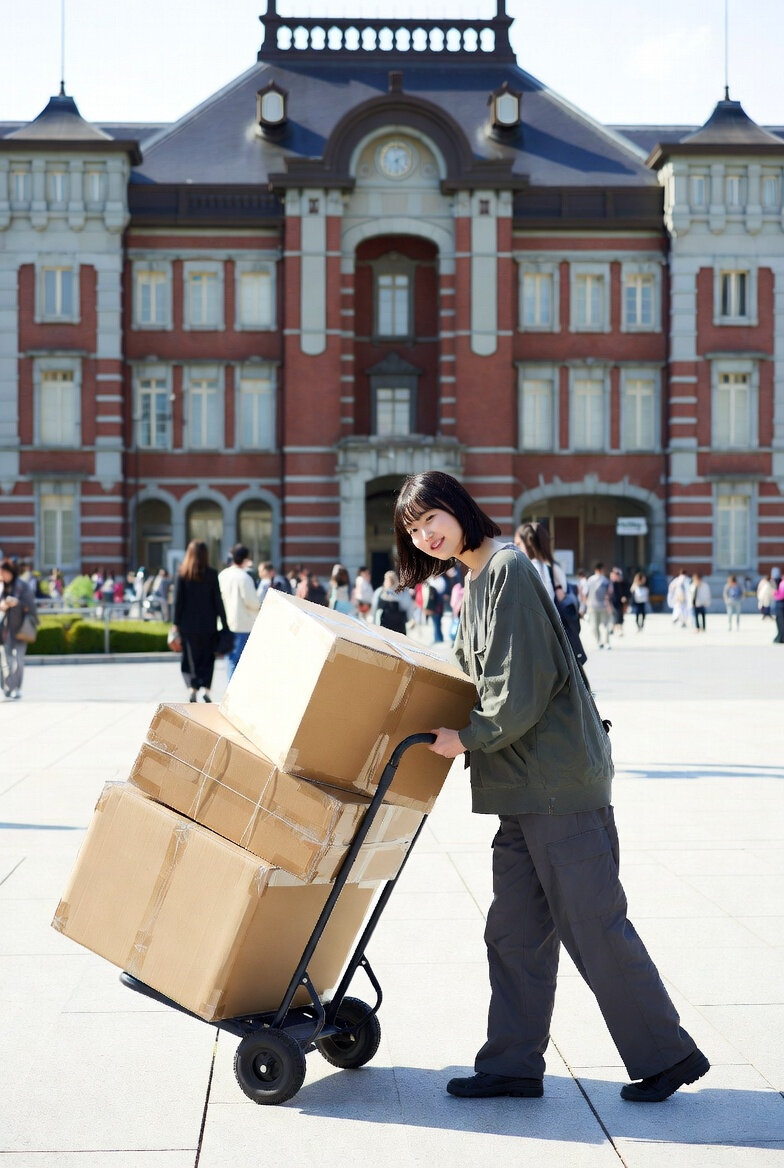 日本人女性25歳のリアルなフォト。はにかんだ微笑み。垢抜けないファッション。引っ越しするための荷物を2輪のカートに固定して引いている。東京駅の駅舎が背景。自然光。プロのカメラマンによる撮影。