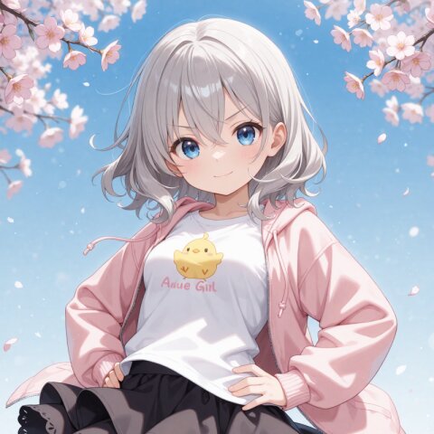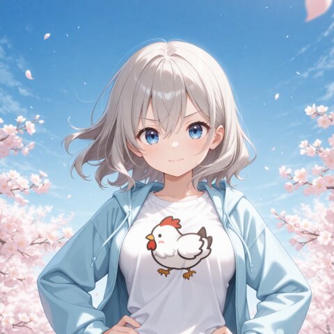Depth of field, Dynamic angle, (A cute girl:1.1), Cute, Solo, Light smile, Light blush, Hands in pockets, Looking at viewer, Cute round face, Blue eyes, Small breasts, Medium hair, Wavy hair, Grey hair, Hair between eyes, Light-green hoodie, Open hoodie, White t-shirt, Untucked shirt, (Layered skirt, Miniskirt:1.2), Lace trim skirt, (Wind lift:0.8), Outdoors, Fashionable street, Ivy, Lush greenery, Falling petals, Crowded, Spring \(season\), Daytime, Masterpiece, Best quality, Amazing quality, Very aesthetic, Absurdres, Highres, Hi res, Newest