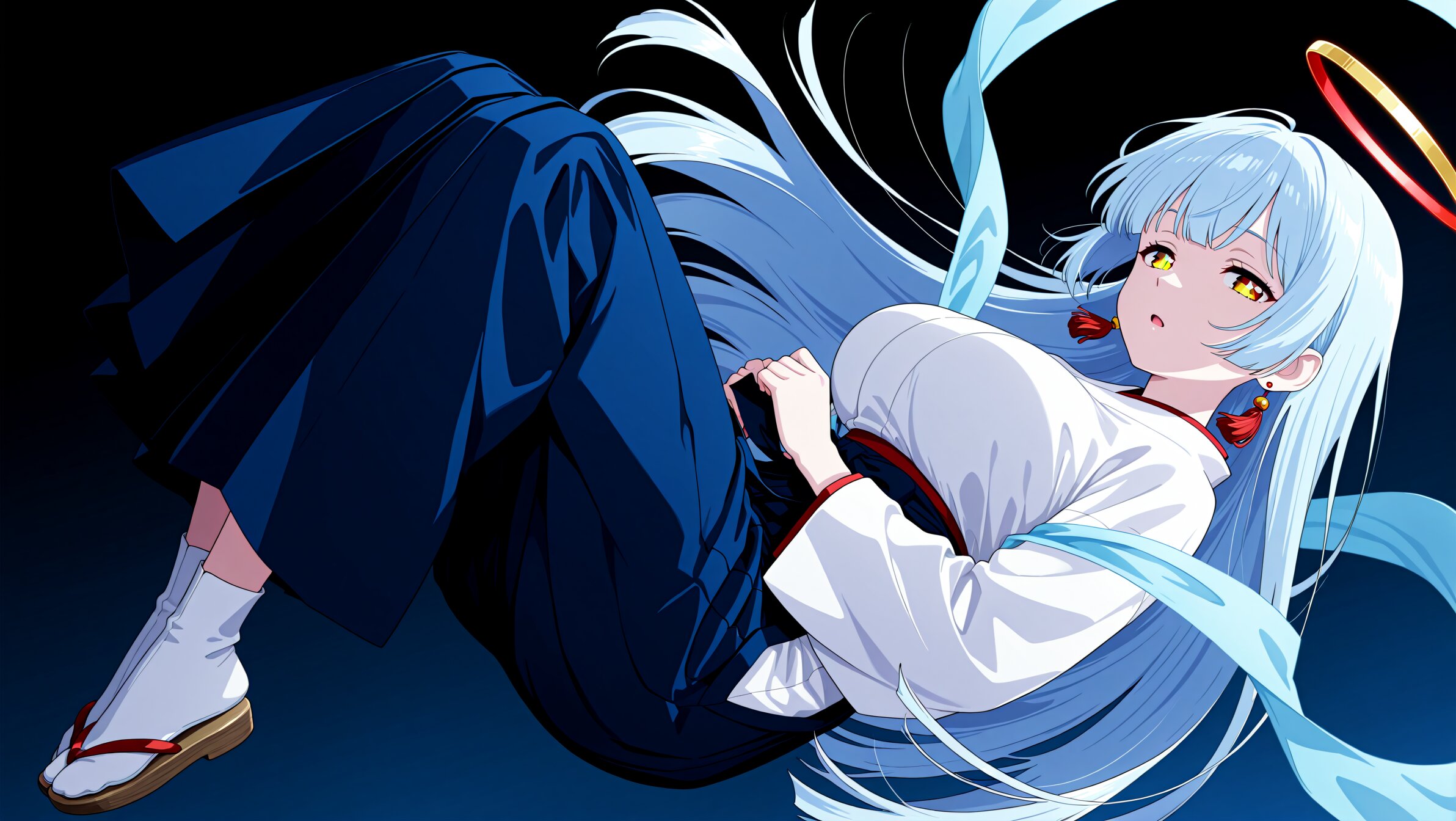 <lora:MeMax6-noob-vpred:1>,memaxl6_a,memaxl6_b,memaxl6_c,memaxl6_d,memaxl6_e, (10's anime style:1.2), (red halo:1.1, ), no headwear, Full HD,32K, 1girl, solo, full body, from side, from below, dutch angle, flying, upside-down, (goddess:1.2), white skin, ((light-blue hagoromo:2.0)), (teenage :1.3), (large breast:2.0), (tareme:1.2), beautiful hair, shiny hair, straight hair:2.0, (light blue hair:1.2), crossed bangs, (hime cut, very long hair:1.1), ahoge, (orange eyes, star-shaped pupils), (Celestial Maiden:1.8), (japanese clothes, red-white miko:1.3, clothing cutout:2.0, long sleeves, red tassel earrings, blue long hakama skirt:2.5, seigaiha:1.6, tabi), expressionless, half-closed eyes, open mouth, looking at viewer, lighting behind:1.2, (simple background, gradient background, blue background, black background, ), floating hair, wind, showing forehead, masterpiece, best quality, super fine illustration, very aesthetic, newest, hyper detailed, intricate, beautiful, aesthetic, highly decorative, HDR, yume kawaii, ,anime screencap,anime,no gradients, 2D flat design, bold outlines,