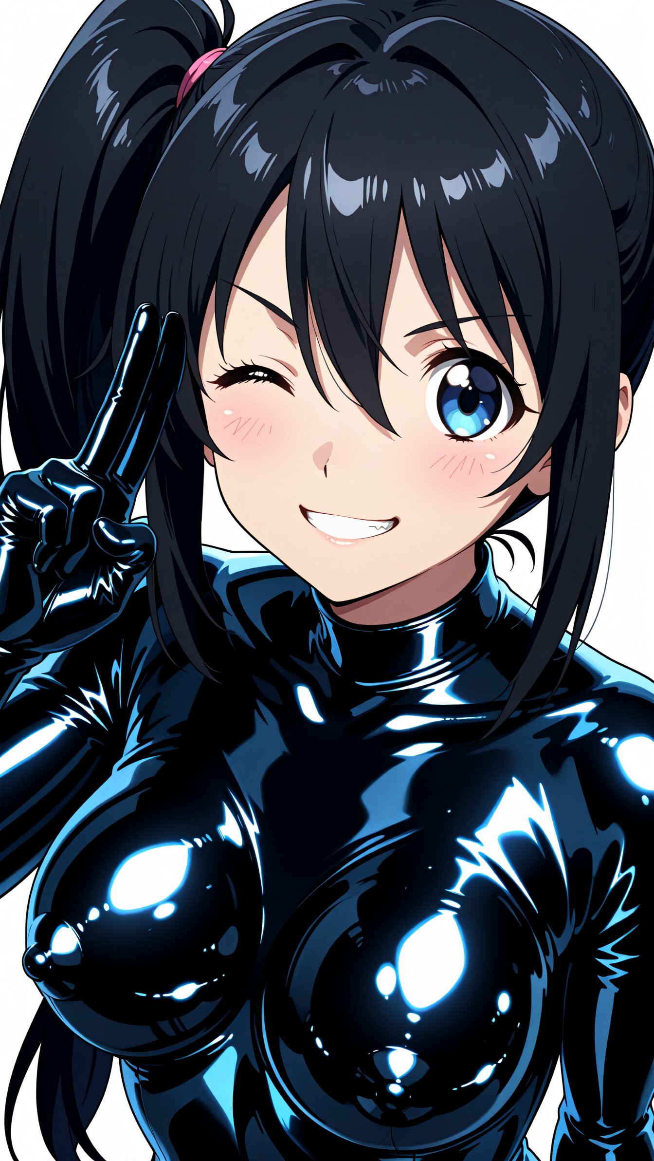 <lora:MeMax6-noob-vpred:1>,memaxl6_a,memaxl6_b,memaxl6_c,memaxl6_d,memaxl6_e, Full HD,32K, 1girl, (teenage):1.4, standing, (portrait:2.0), breasts focus:1.2, from above, solo, smile, one eye closed, grin, looking at viewer, v-shaped eyebrows, hand on own hip, two-finger salute, medium breasts, (teenage :1.3), (blue eyes), (long side ponytail:2.0), sideburns, hair between eyes, (((tareme))), (black hair), (beautiful hair), (shiny hair), (medium breasts), slender, blush, shiny clothes:1.8, ((((((black latex bodysuit:1.4)))))), ((black latex clothes:2.0)), (((skin tight))) ,(((tight clothes))), ((((seamless clothes)))):2.0, ((((((((shiny black latex bodysuit, shiny clothes, )))))))), ((black latex gloves)),((((no zippers)))), (covered nipples:1.6), erectile nipples, (simple background, white background), masterpiece, best quality, super fine illustration, very aesthetic, newest, hyper detailed, intricate, beautiful, aesthetic, highly decorative, HDR, yume kawaii, ,anime screencap,anime,no gradients, 2D flat design, bold outlines, 10's anime style,